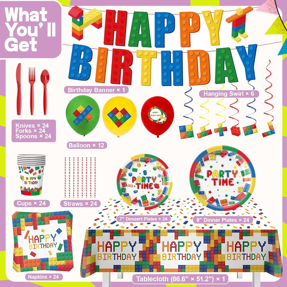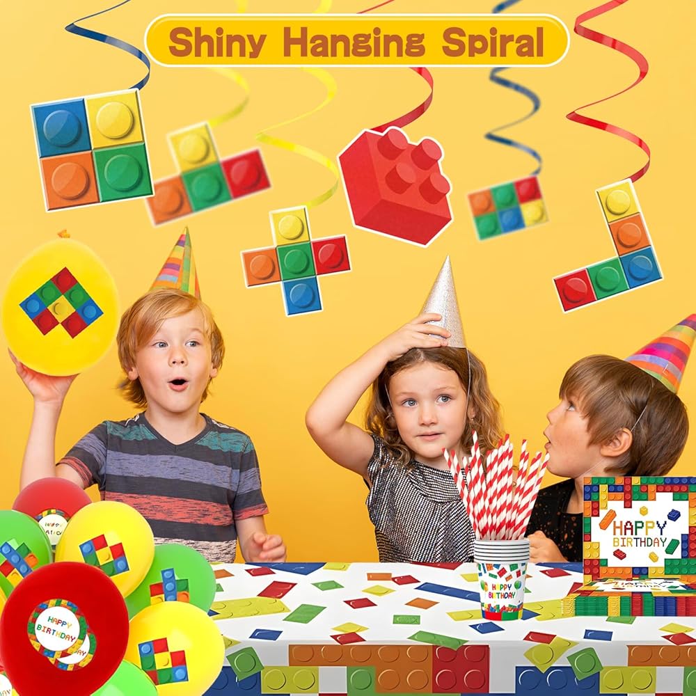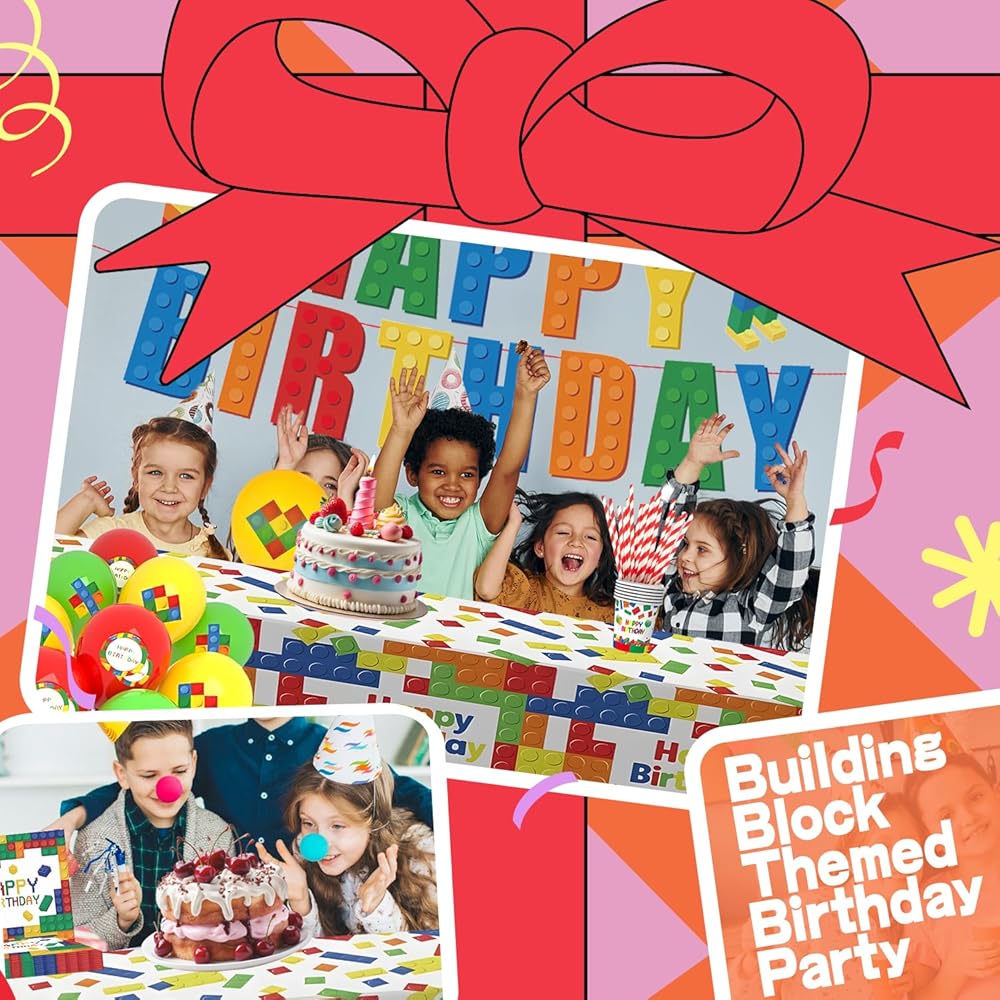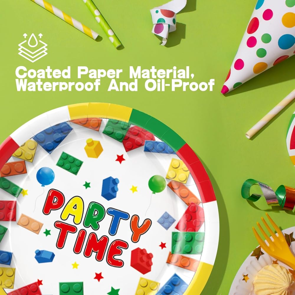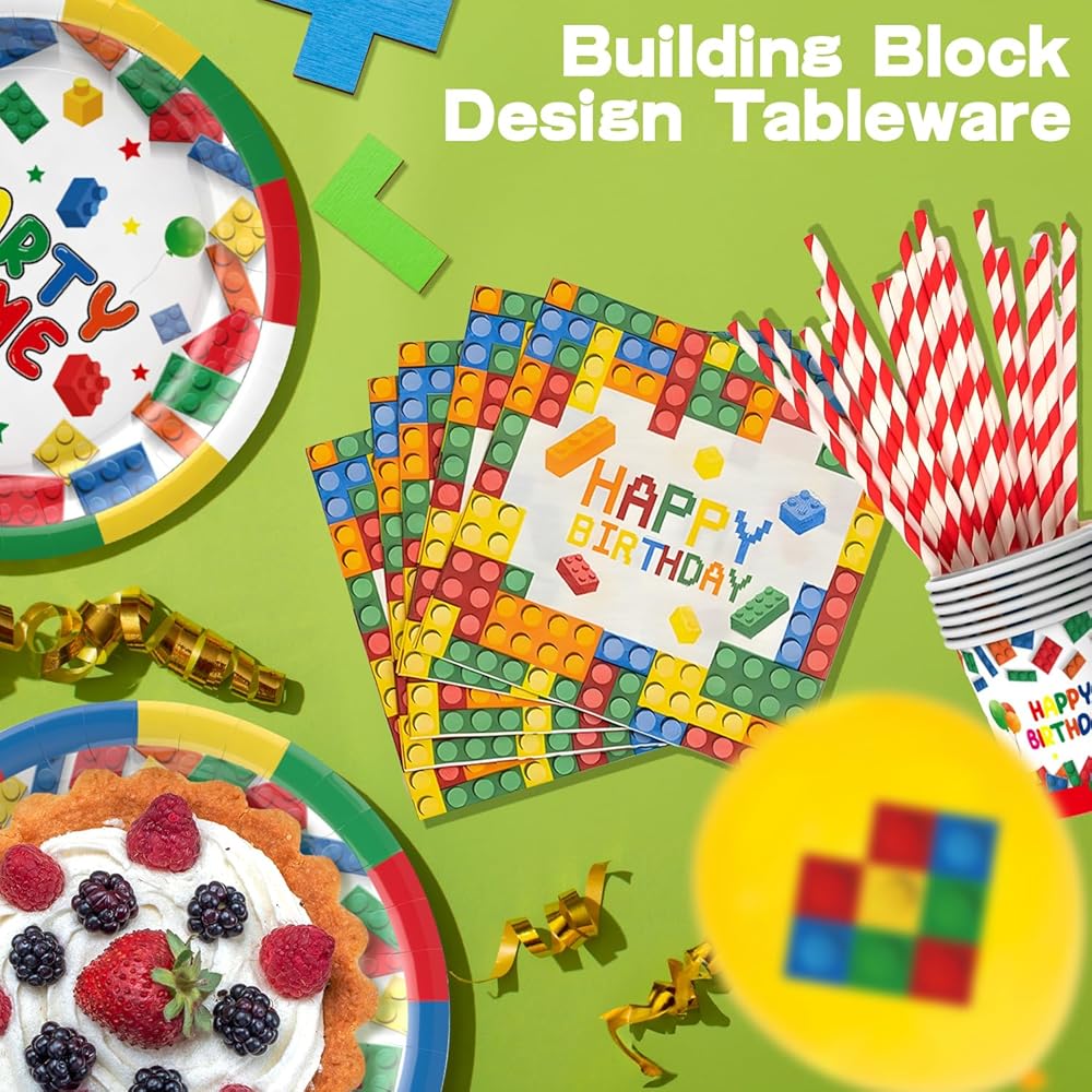 أنماط مبتكرة ومبتكرة - تتكون المجموعة من الألوان الأحمر والأصفر والأخضر والأبيض، مع ملحقات ذات ألوان زاهية، مثالية للبالغين والأطفال. المجموعة مصممة بمكعبات بناء، مناسبة لجميع أنواع ديكورات الحفلات. مجموعة أدوات مائدة الحفلات هذه جذابة ورائعة للغاية، مما سيضيف نقاطًا إلى حفلتك.