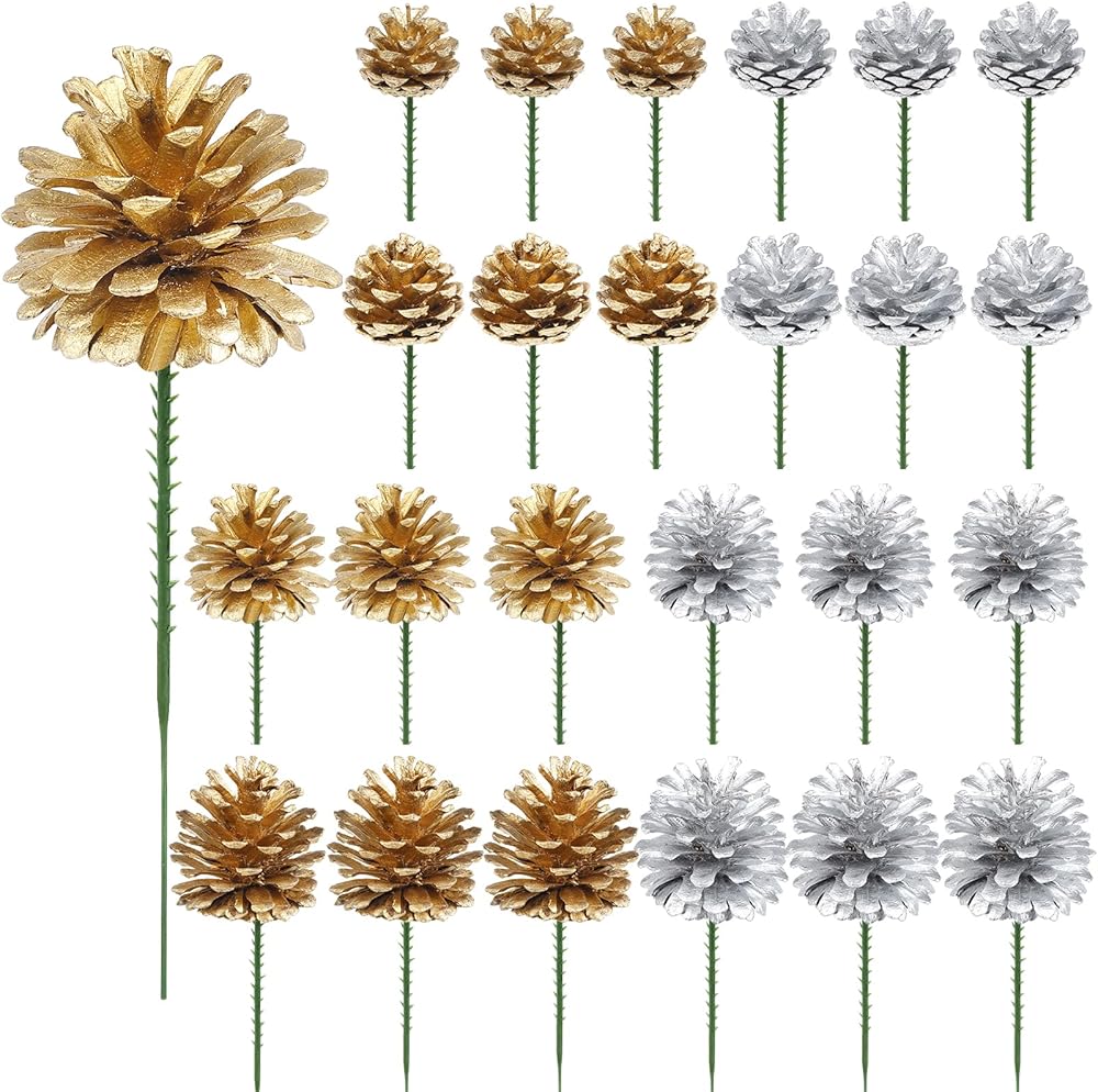 24 قطعة من زينة مخاريط الصنوبر لعيد الميلاد، مقاسات مختلفة مخاريط الصنوبر الطبيعية مع أعواد سلكية، مخاريط صنوبر طبيعية لتزيين شجرة عيد الميلاد إكليل إكليل من الزهور ديكور المنزل (فضي ذهبي)