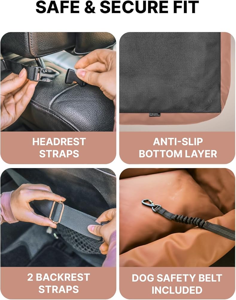 Quick and steady installation One headrest attachment strap, two seat back straps, and a non-slip bottom coating firmly hold this dog car seat in place, while installation takes no more than a few minutes.