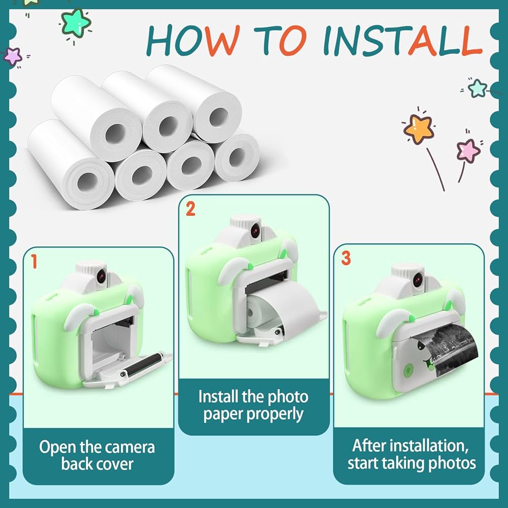 • EASY TO USE: our kids camera paper roll refill is compatible with various styles of instant cameras for children. Its installation is very simple, children just need to insert the thermal paper in the correct direction and make sure it stays inside the camera cover.
