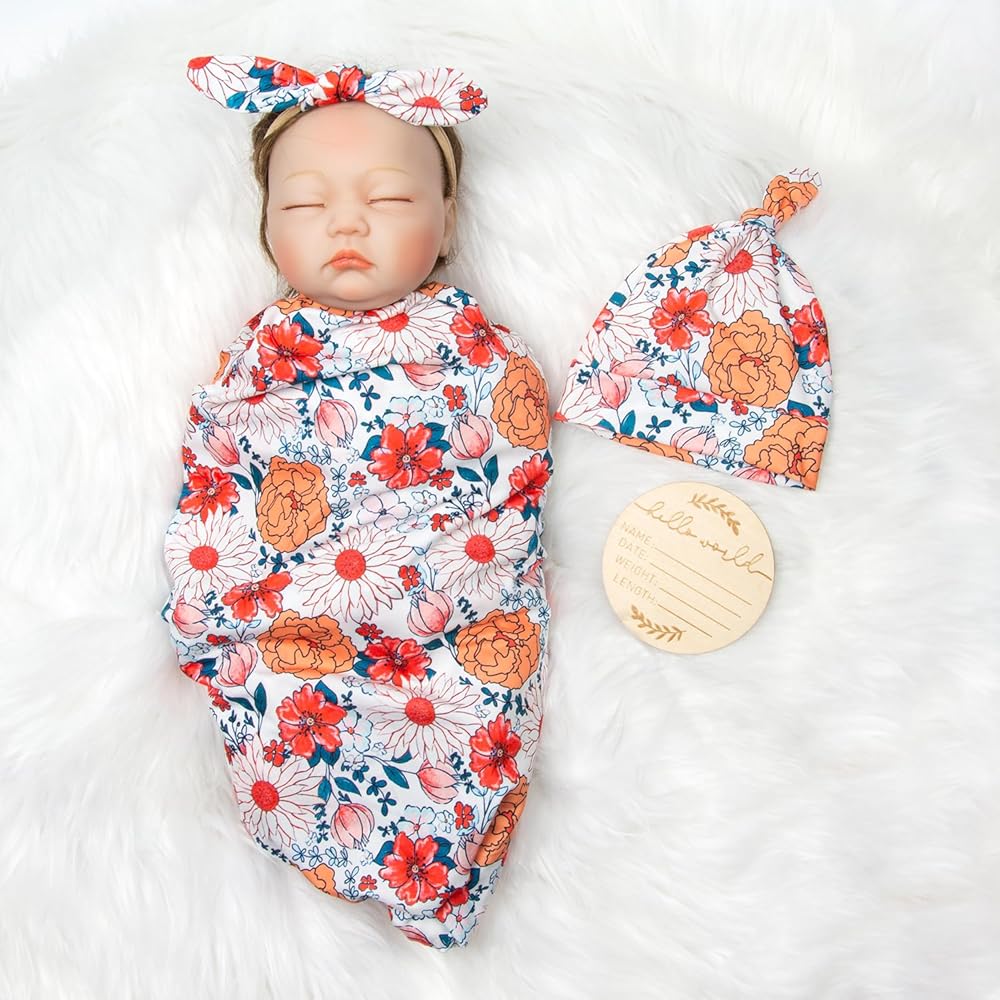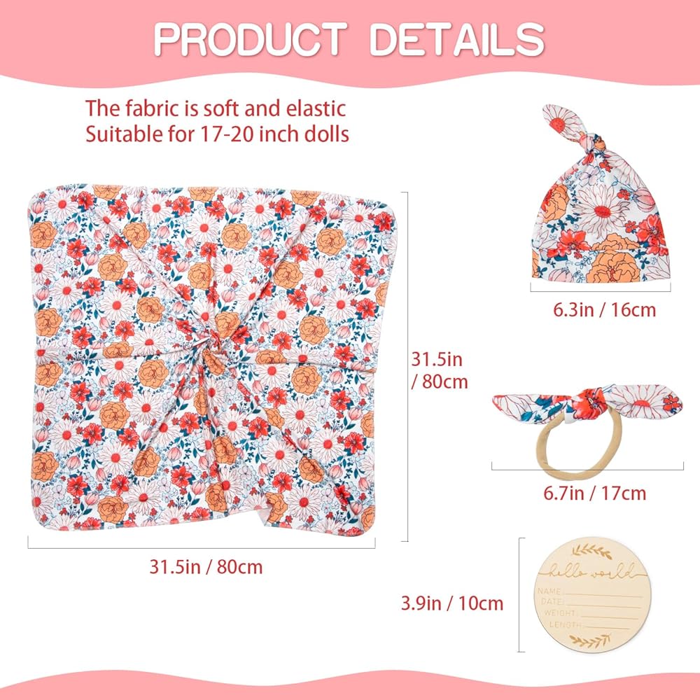 22 بوصة تولد من جديد طفل إكسسوارات دمي قماط مجموعة 4 قطعة بدلة طباعة برتقالية ل 17-22 بوصة تولد من جديد دمية طفل قماط بطانية قبعة بطاقة
