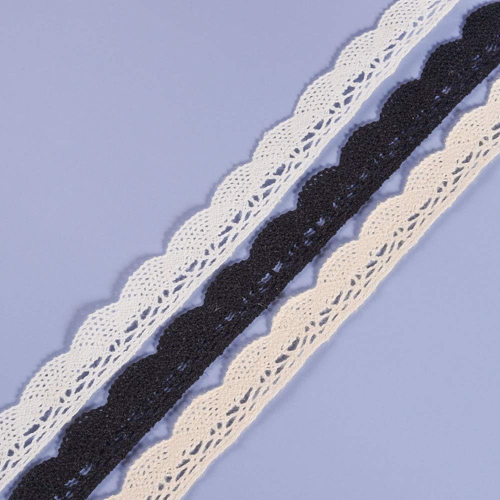 زخرفة دانتيل متعددة الألوان: 3 قطع من زخارف الدانتيل القطنية باللون البيج والأبيض والأسود معبأة معًا في عبوة واحدة، العرض 3/4 بوصة، الطول 16.5 ياردة (594 بوصة)، إجمالي 16.4 ياردة. ألوان متعددة يمكن أن تلبي احتياجاتك المختلفة