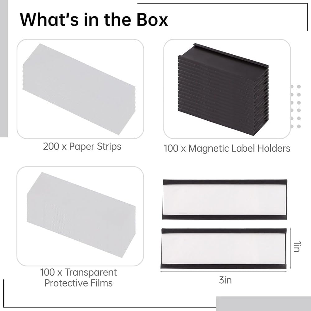 【مجموعة كبيرة مكونة من 100 قطعة】يتضمن منتجنا 100 حامل ملصقات مغناطيسي، و100 فيلم حماية شفاف، و200 شريط ورقي قابل للكتابة، مما يلبي احتياجات العرض المختلفة والاحتياجات التنظيمية في حياتك اليومية. شاركها مع الآخرين أو استفد منها بشكل كامل بنفسك.