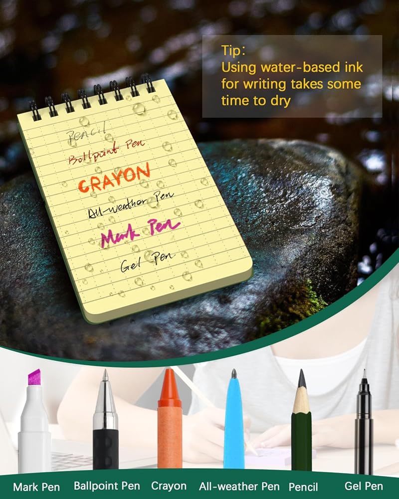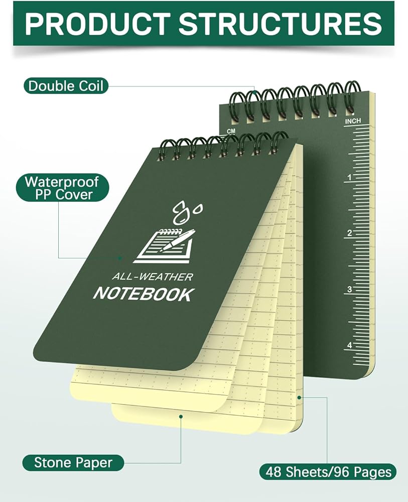 These mini notebooks are are all-weather notepads, they are crafted from high-quality waterproof materials, including PP covers and stone paper inner pages, ensuring resilience against sweat, dirt, grease, and mud. They are suitable for use in any environment, whether rain or shine. Their robust construction ensures they won't turn to mush in wet conditions, making them reliable in outdoor activities or work.