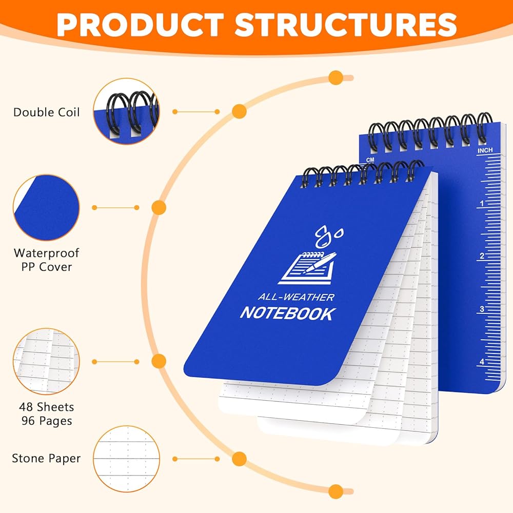 Our package includes 12 small waterproof spiral notebooks, each measuring 3 x 5 inches (48 sheets/96 pages). Featuring vibrant colored PP covers, double black coil bindings, and stone paper inner pages, they are stylish and durable.