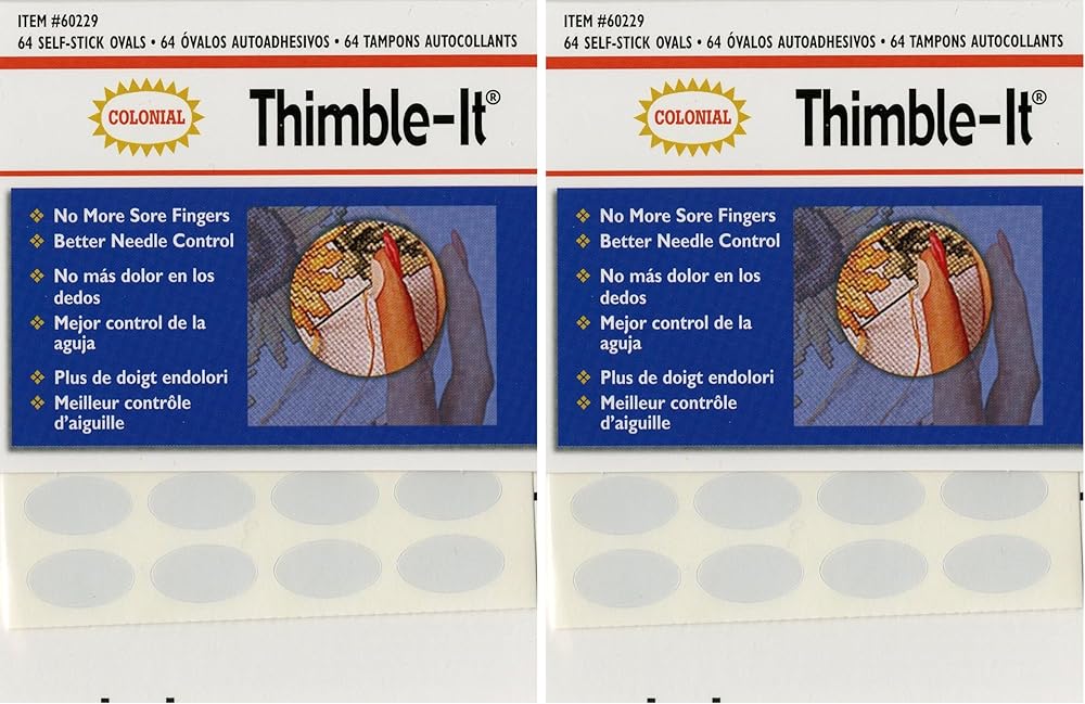 Thimble-it self-adhesive finger pads. No more sore fingers! natural feeling self-adhesive finger pads make hand stitching easier and more comfortable. Apply one pad per working fingertip and enjoy hours of sewing pleasure. The thimble-it sticks securely on the tip of the finger. The perfect start to any project. Made in United States.