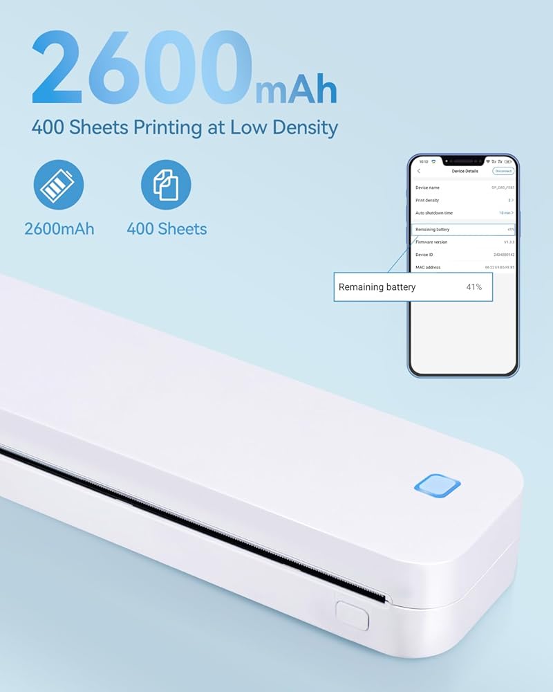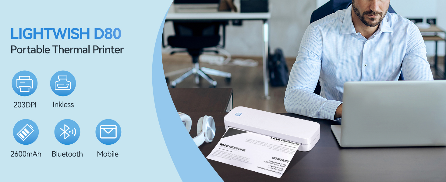 【بطارية محمولة تدوم طويلاً】تم تصميم طابعتنا المحمولة لتوفير أقصى قدر من الحركة، وتزن 600 جرام فقط. 【تأتي مع لفة من الورق الحراري مقاس A4】 يمكن وضعها بسهولة في حقيبة أو حقيبة ظهر، مثالية للسفر ورحلات العمل وسيناريوهات الطوارئ. يمكنك بسهولة طباعة العقود والمستندات المكتبية والفواتير وملصقات الشحن وبطاقات الصعود إلى الطائرة والمزيد من أجلك. يتميز طراز LIGHTWISH D80 الذي تمت ترقيته ببطارية مدمجة بقوة 2600 مللي أمبير في الساعة تسمح بالاستخدام الممتد، وهي قادرة على طباعة ما يصل إلى 400 صفحة بشحنة واحدة بكثافة طباعة منخفضة، مما يضمن استمرار إنتاجيتك دون قلق.