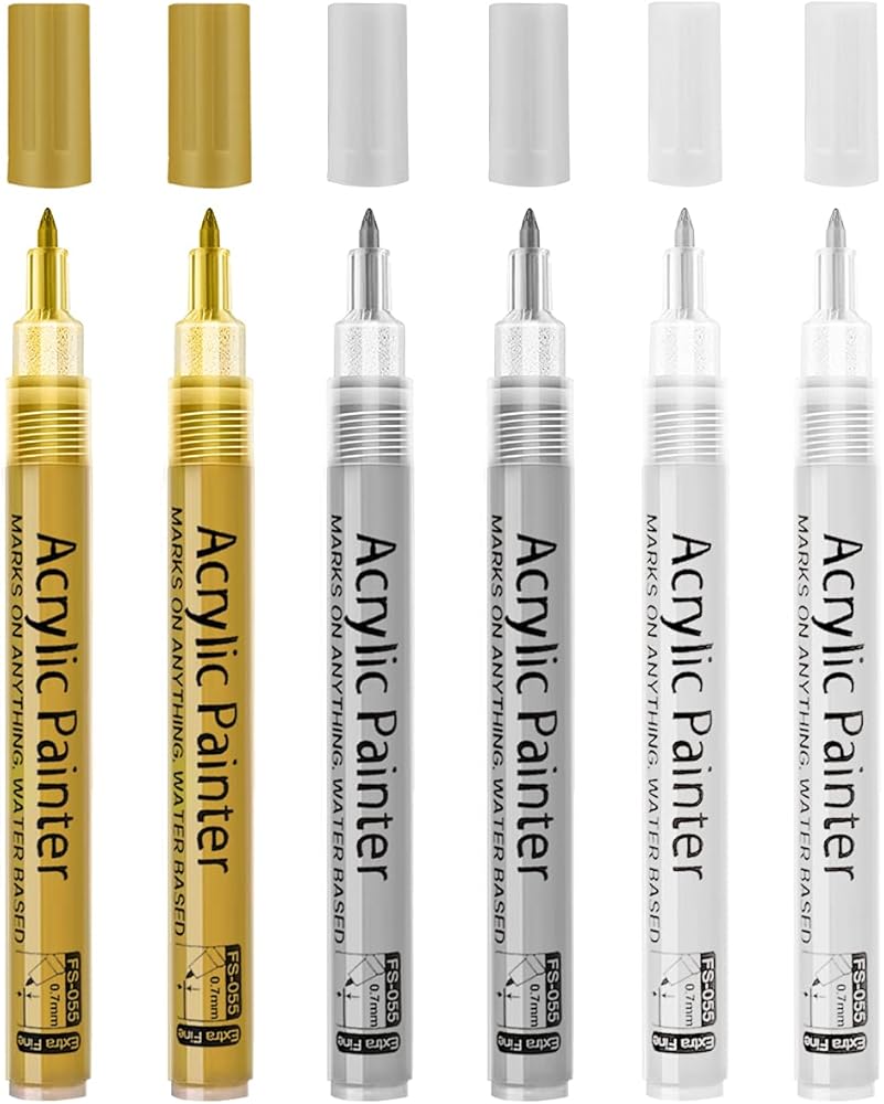 مجموعة أقلام التحديد المعدنية: 3 حبر أكريليك أسود و3 أبيض يجف بسرعة لإنتاج لمسة نهائية لامعة وغير شفافة ومتينة للغاية على جميع الأسطح تقريبًا.