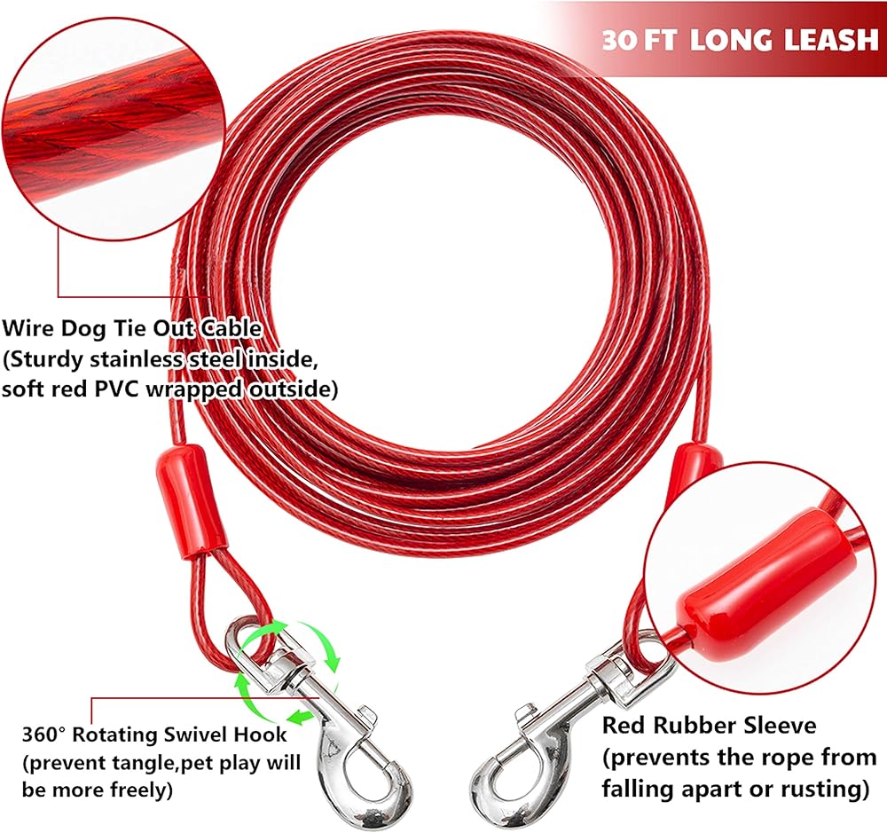 الجزء الداخلي لكيبل الكلب هذا مصنوع من الستانلس ستيل، متين وليس من السهل كسره، الطبقة الخارجية ملفوفة ببلاستيك PVC الأحمر الناعم، والذي يمكنه حماية سلامة الحيوانات الأليفة ويديك. طرفي زمام الكلب مع خطاف دوار 360 درجة لتحقيق منطقة تجوال بزاوية 360 درجة دون القلق بشأن التشابك. تسمح الألوان الزاهية للأشخاص بالتقاط حركات الحيوان الأليف بسرعة لمنع فقدان الكلب أو تجنب السقوط.
