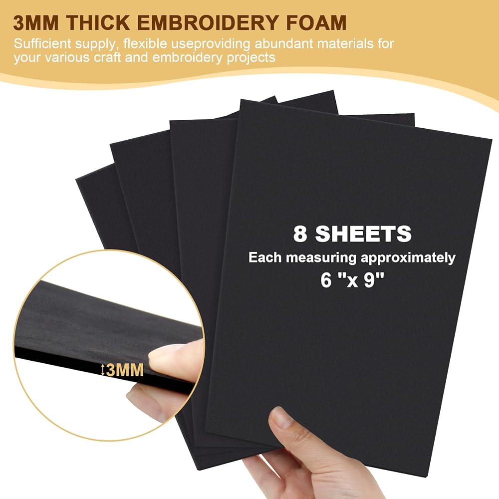 • SUFFICIENT SUPPLY, FLEXIBLE USE: This package contains 8 sheets of 3mm thick embroidery foam, each measuring approximately 6 x 9 inches, providing abundant materials for your various craft and embroidery projects. They are perfect for making hats, quilts, clothing, bags, home decorations, etc. The size and thickness of each piece of foam provides the ideal flexibility for your designs, allowing you to create beautiful 3D effects.