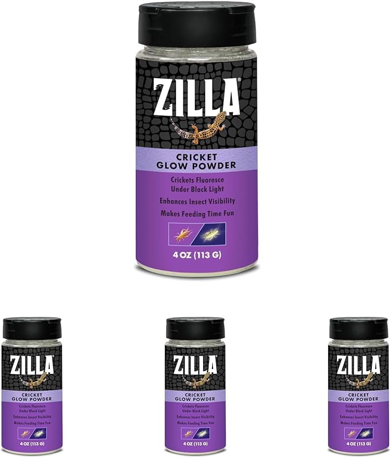 Zilla offers a wide range of products so that you can not only maintain a healthy diet for your reptile, but a fun one! Zilla Cricket Glow Powder is the ultimate way to elevate your reptile's meals by enhancing cricket visibility under a black light. The unique formula makes it more fun compared to other dust products or calcium products. Designed to make feeding your reptiles fun and easy. Simply shake the product over crickets in a holding container, shake gently making sure they're thoroughly coated. Add to the enclosure for your pet to enjoy. Celebrate your pet and Rep Yourself, with Zilla.