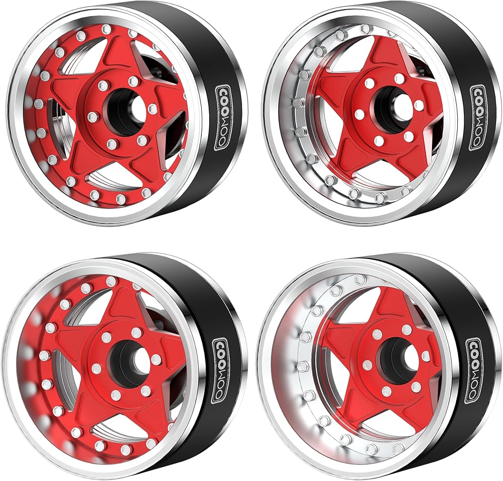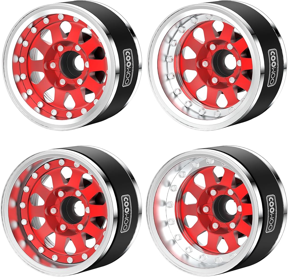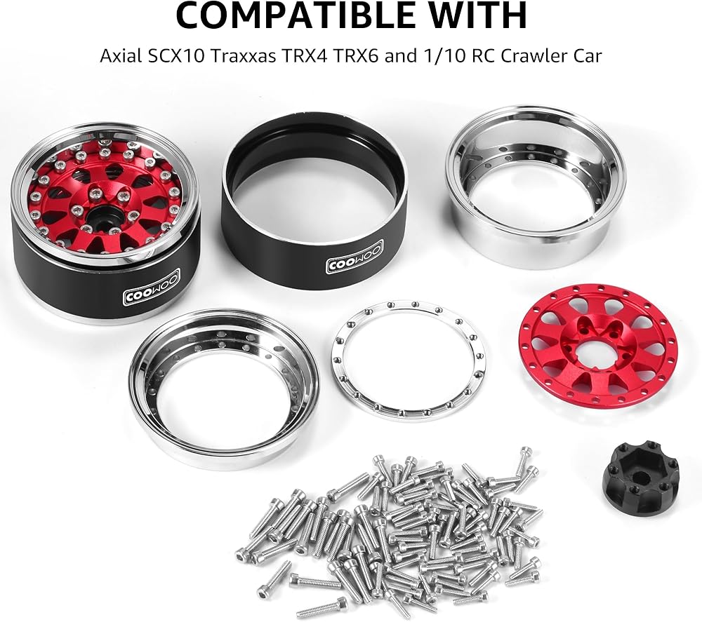 أجزاء ترقية عجلات COOWOO RC، 1.9 بوصة عجلات Beadlock قابلة للتعديل لشاحنات 1/10 TRX6 TRX4 أو SCX10 RC، مصنوعة من سبائك الألومنيوم، على شكل دمعة، مجموعة من 4 قطع، أحمر