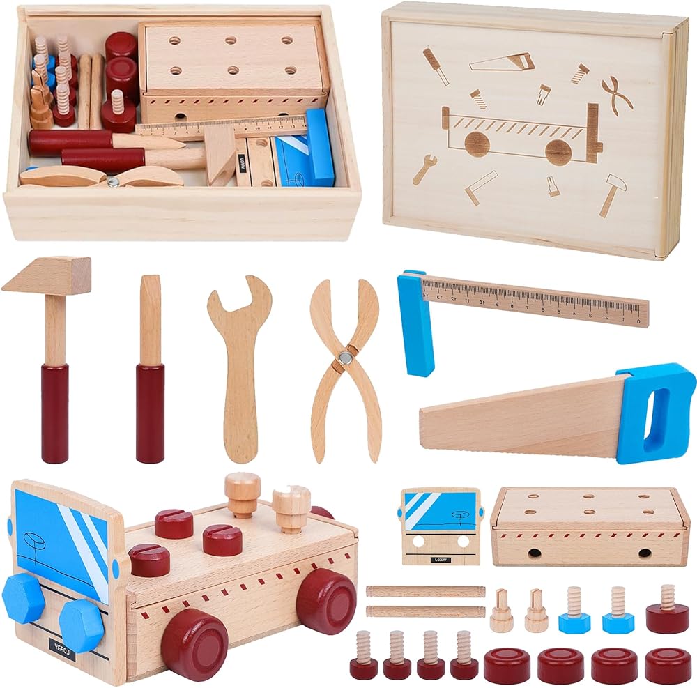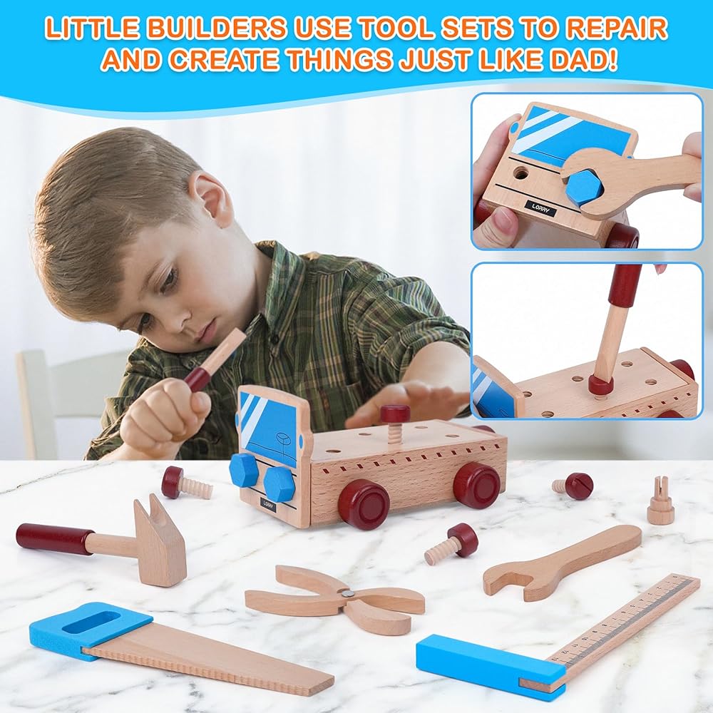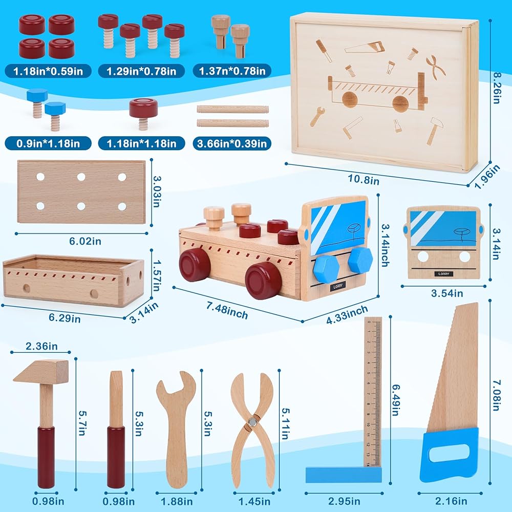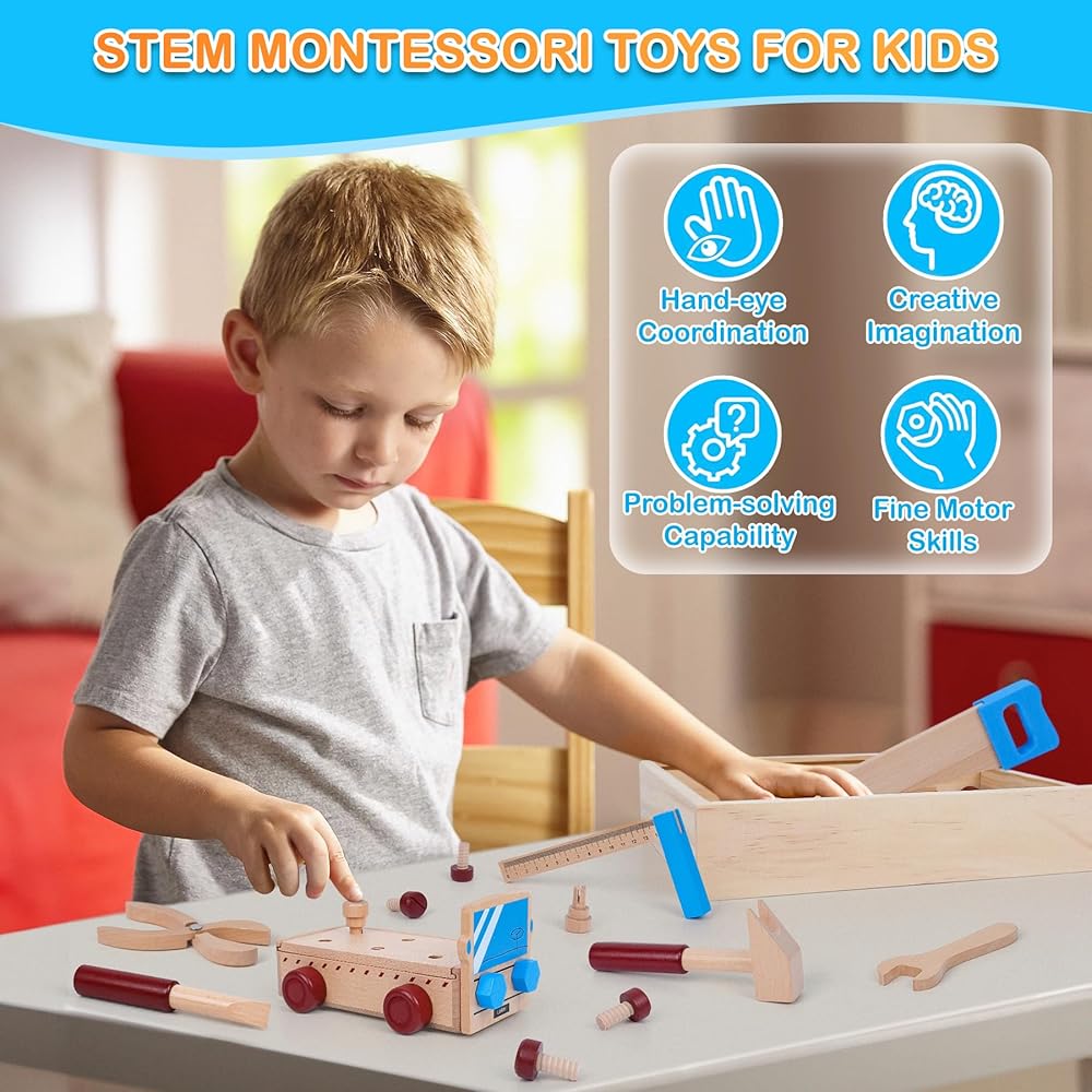مجموعة أدوات خشبية للأطفال الصغار مجموعة أدوات شاحنة خشبية بما في ذلك صندوق أدوات خشبي ألعاب مونتيسوري للأولاد والبنات 2 3 4 سنوات مرحلة ما قبل المدرسة التعليمية الجذعية التظاهر اللعب عيد الميلاد عيد الميلاد هدية عيد الميلاد