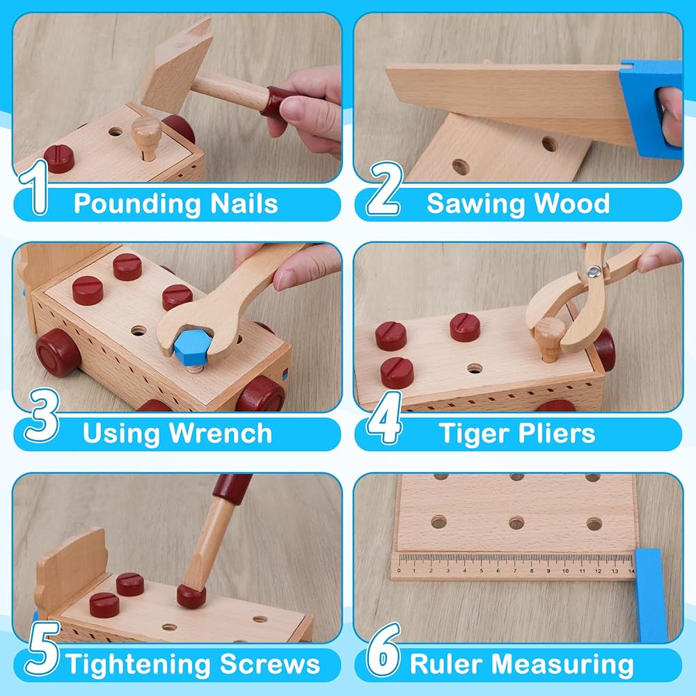 إنه جاهز للعمل! مجموعة أدوات الأطفال الخشبية للأطفال من سن 1 إلى 3 سنوات تعمل بكامل طاقتها. دع أطفالك يستمتعون بتجربة الأدوات المختلفة! فرص لممارسة مهارات حياتية جديدة في بيئة آمنة. يمكن للأطفال تعلم لف البراغي باستخدام مفك البراغي، واستخدام مفتاح البراغي، ومنشار الخشب، وبناء نماذج مختلفة، مثل لعبة الشاحنة الخشبية القابلة للفصل التي تأتي معها لعبة مونتيسوري الخشبية هذه.