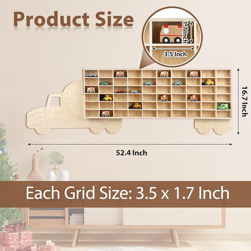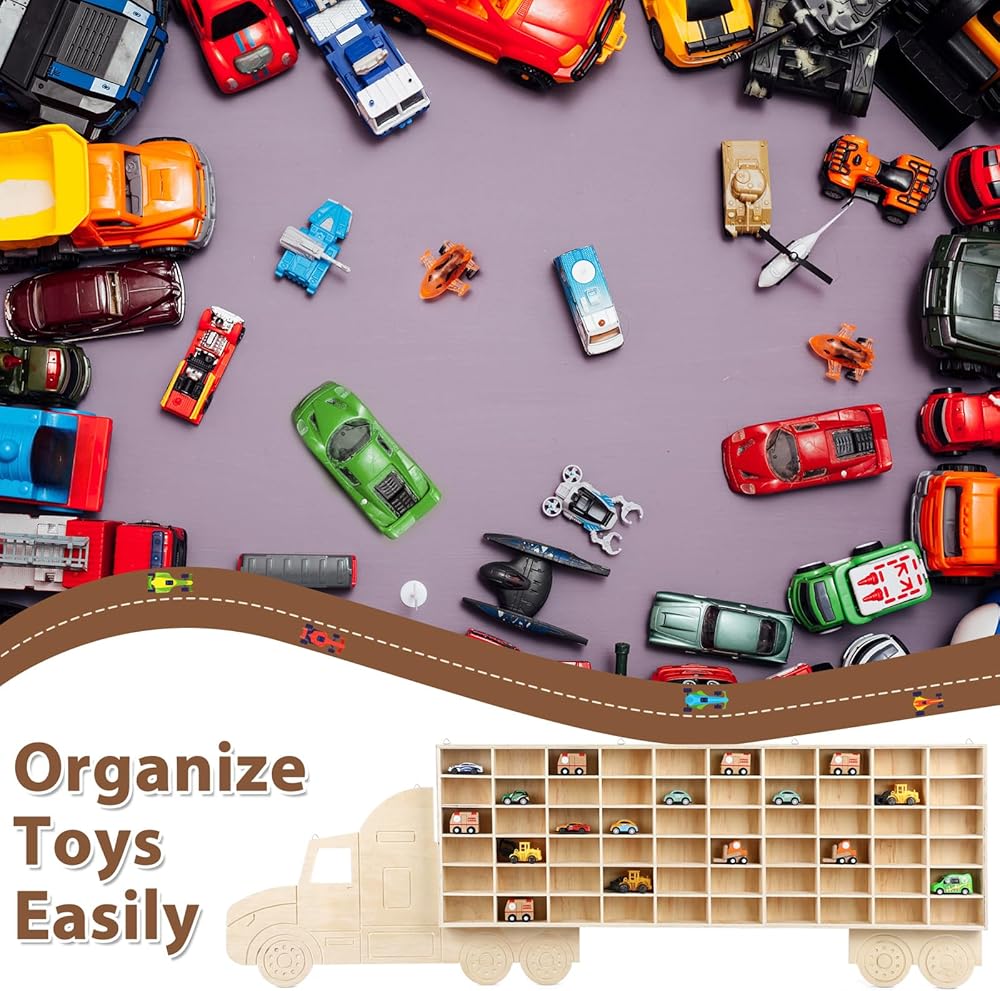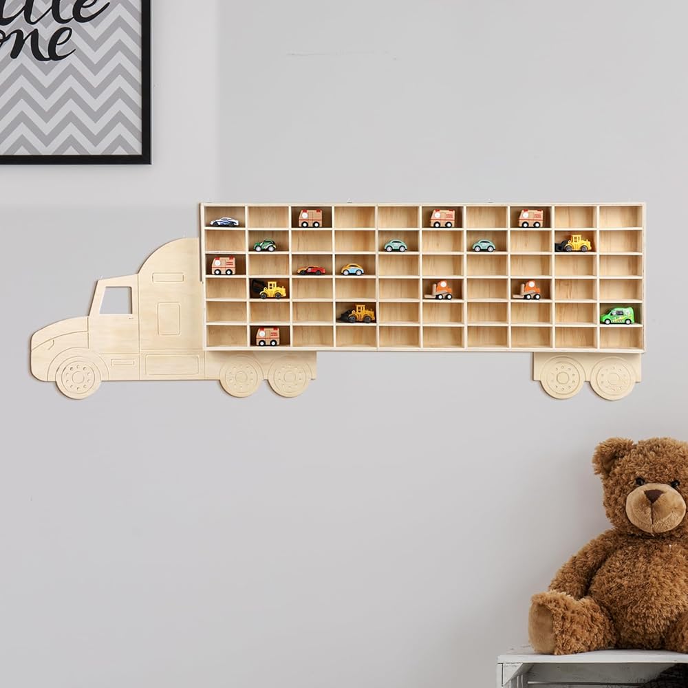 Vercraft Wood Toy Car Display Rack, 60 Space Toy Car Display Shelves Car Toy Wall Mounted Organizer Truck for Model Cars Collectibles Toy Figurines Tiny Dolls (Hauler)