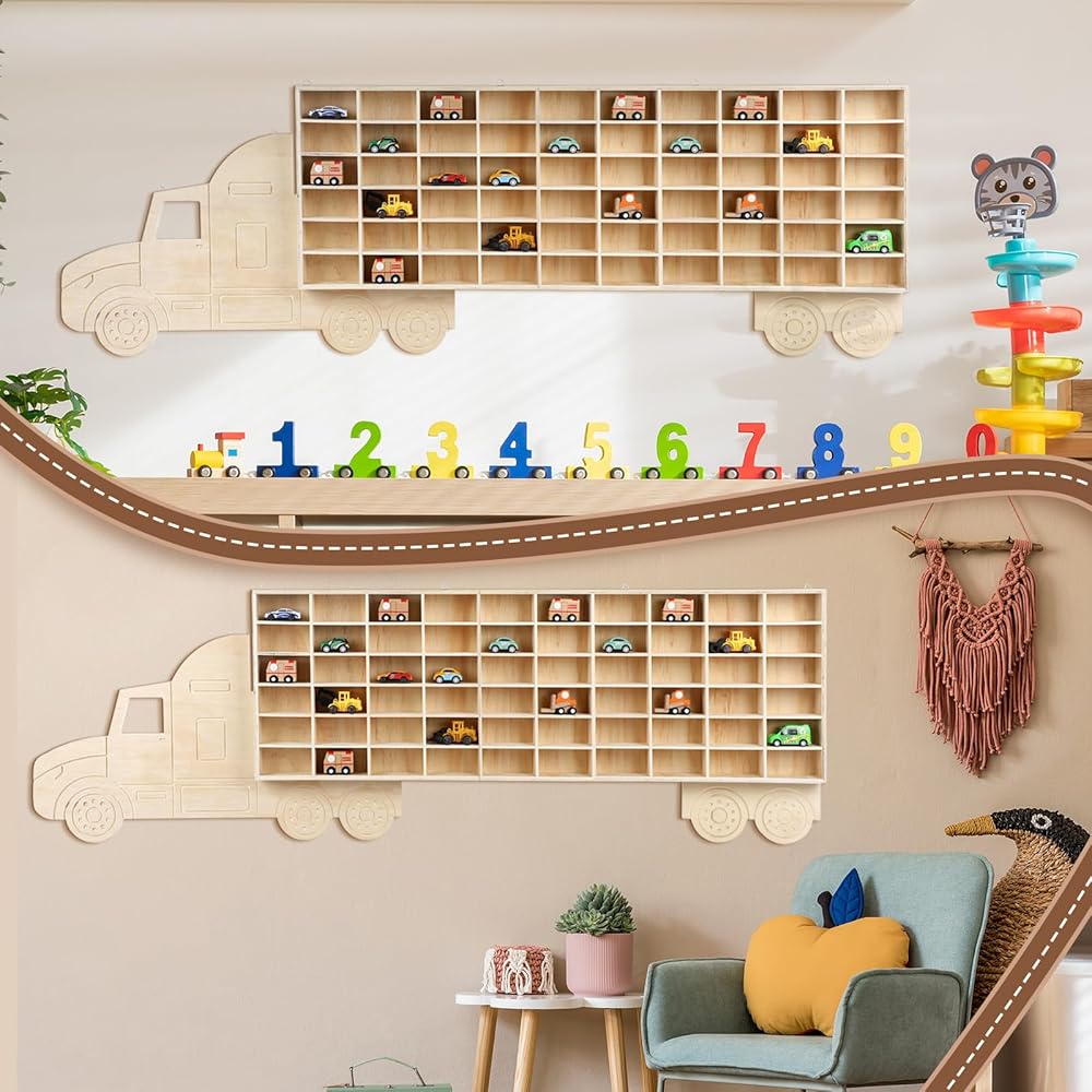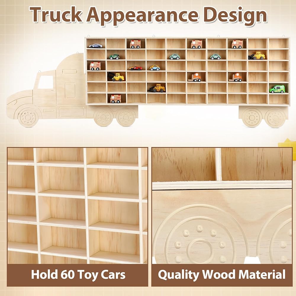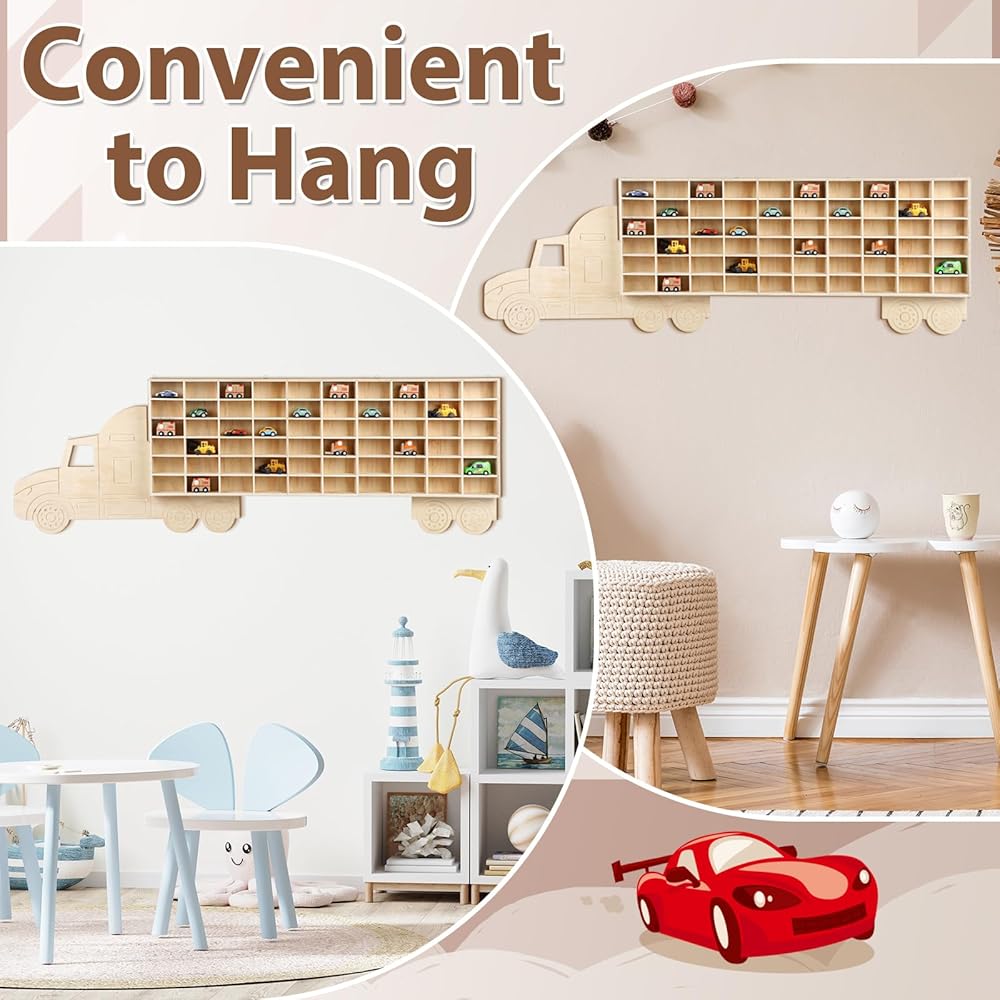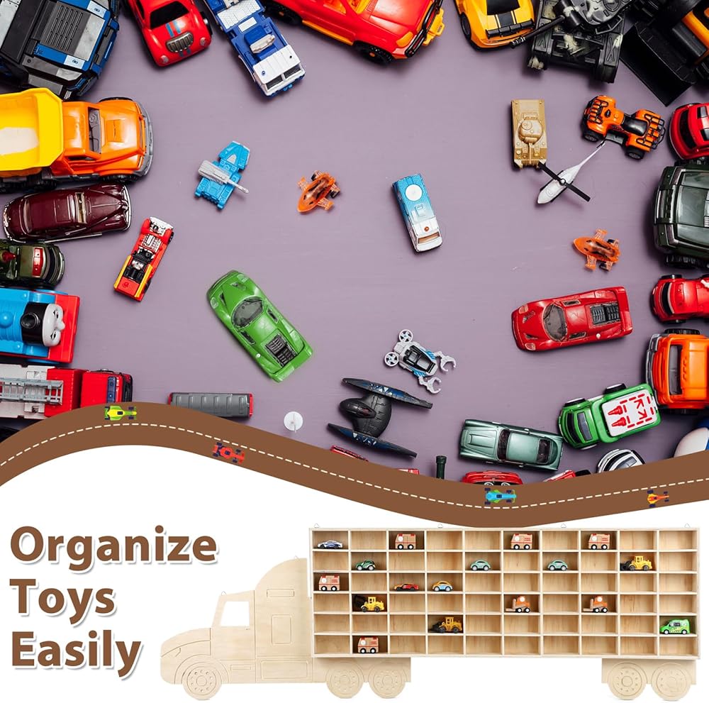 Vercraft Wood Toy Car Display Rack, 60 Space Toy Car Display Shelves Car Toy Wall Mounted Organizer Truck for Model Cars Collectibles Toy Figurines Tiny Dolls (Hauler)
