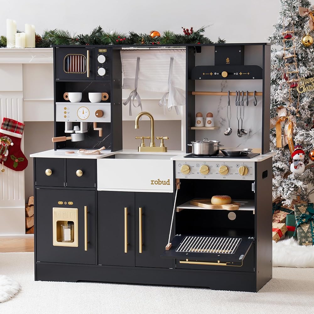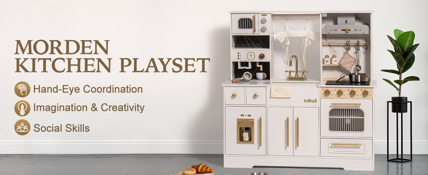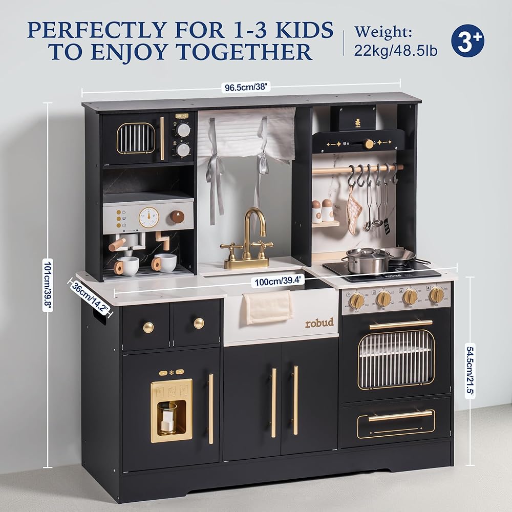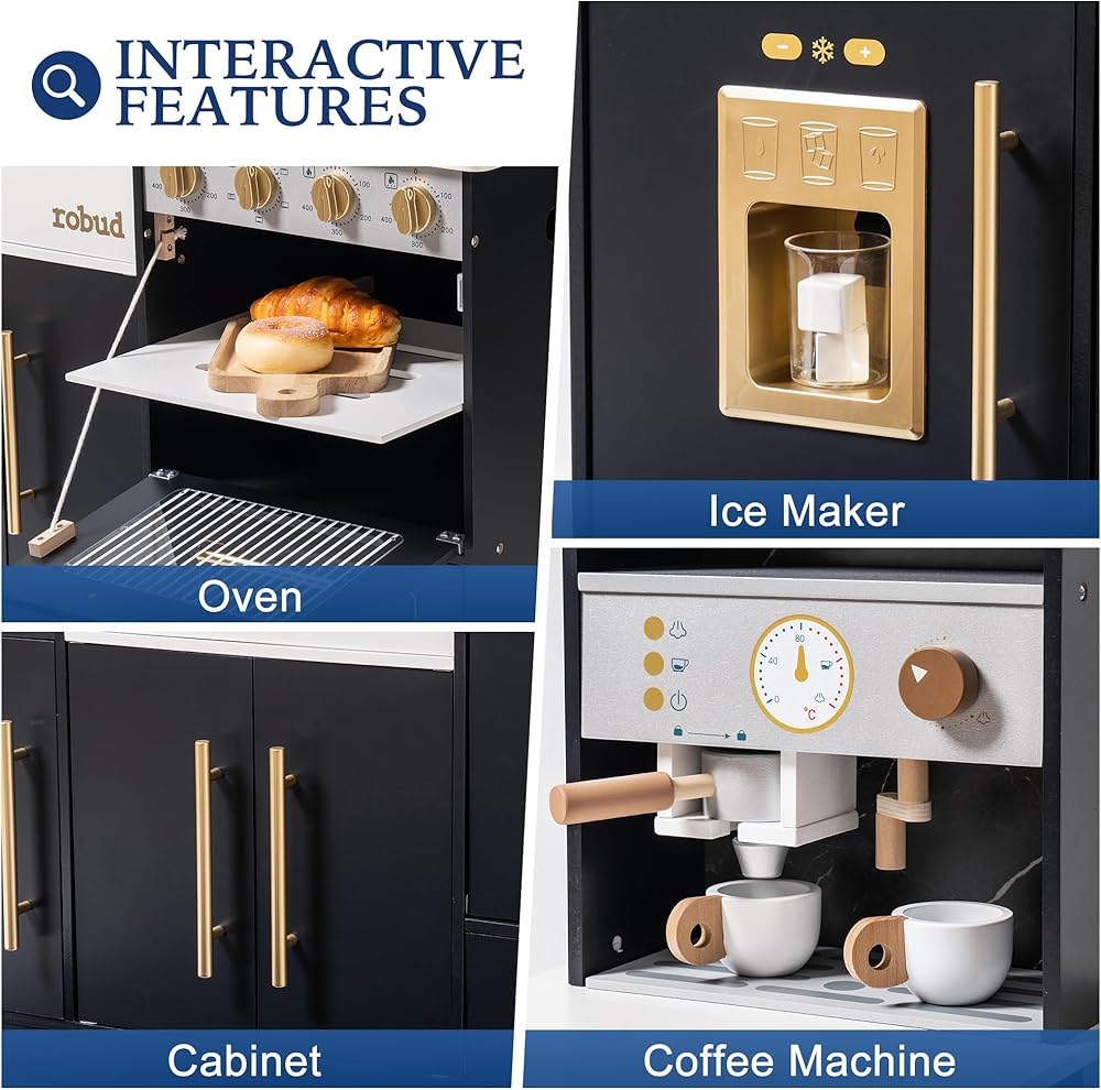 • تصميم واقعي وإبداع شرارة: تتميز مجموعة مطبخ الأطفال الفاخرة باللونين الأبيض والذهبي من ROBUD بتصميم وتفاصيل رائعة مثل الصنبور الحقيقي وآلة القهوة والفرن والأواني، مما يوفر تجربة لعب المطبخ الأكثر واقعية لإشعال إبداع طفلك وخياله.