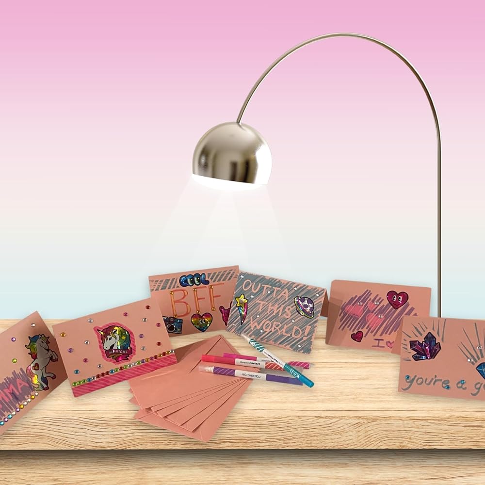 Comprehensive Card Making Kit: Our card making kit for kids and adults includes 6 pink notecards, 6 pink envelopes, sparkle stickers, sticker gems, and color-changing markers. This kit is perfect for creating unique stationary for girls and makes an ideal gift for 6 year old girls.