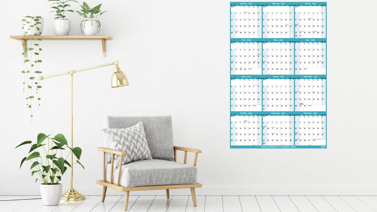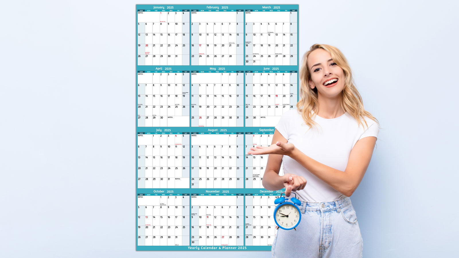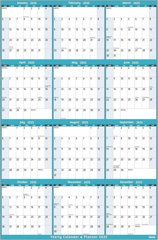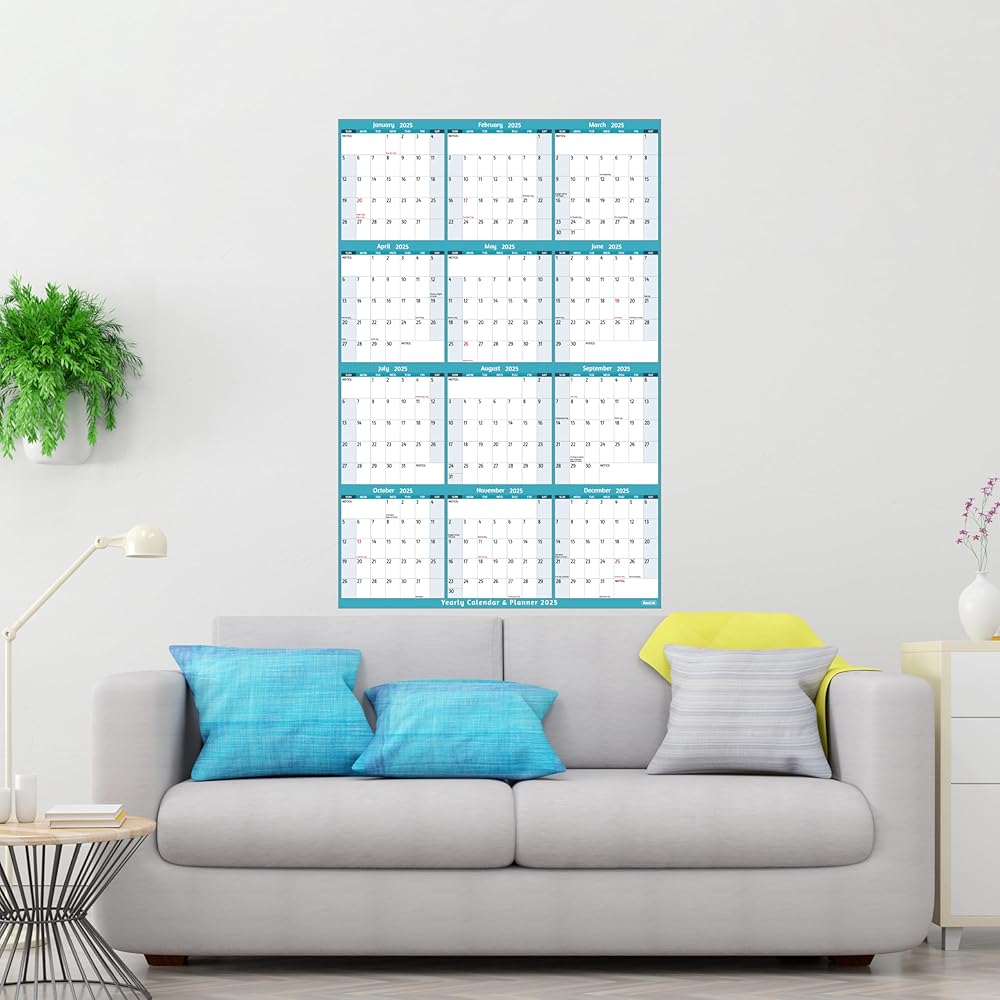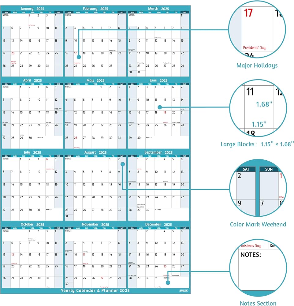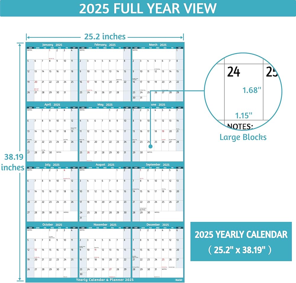 🎄 تقويم حائط سنوي 2025 - يغطي تقويم 2025 عام 2025 بالكامل، من يناير 2025 إلى ديسمبر 2025. الحجم المفتوح: 25.2 بوصة × 38.19 بوصة مع الملاحظات، بما في ذلك العطلات. يوفر هذا التقويم عرضًا على مدى فترة زمنية كبيرة لتمكين خطط العام بأكمله من إلقاء نظرة سريعة.