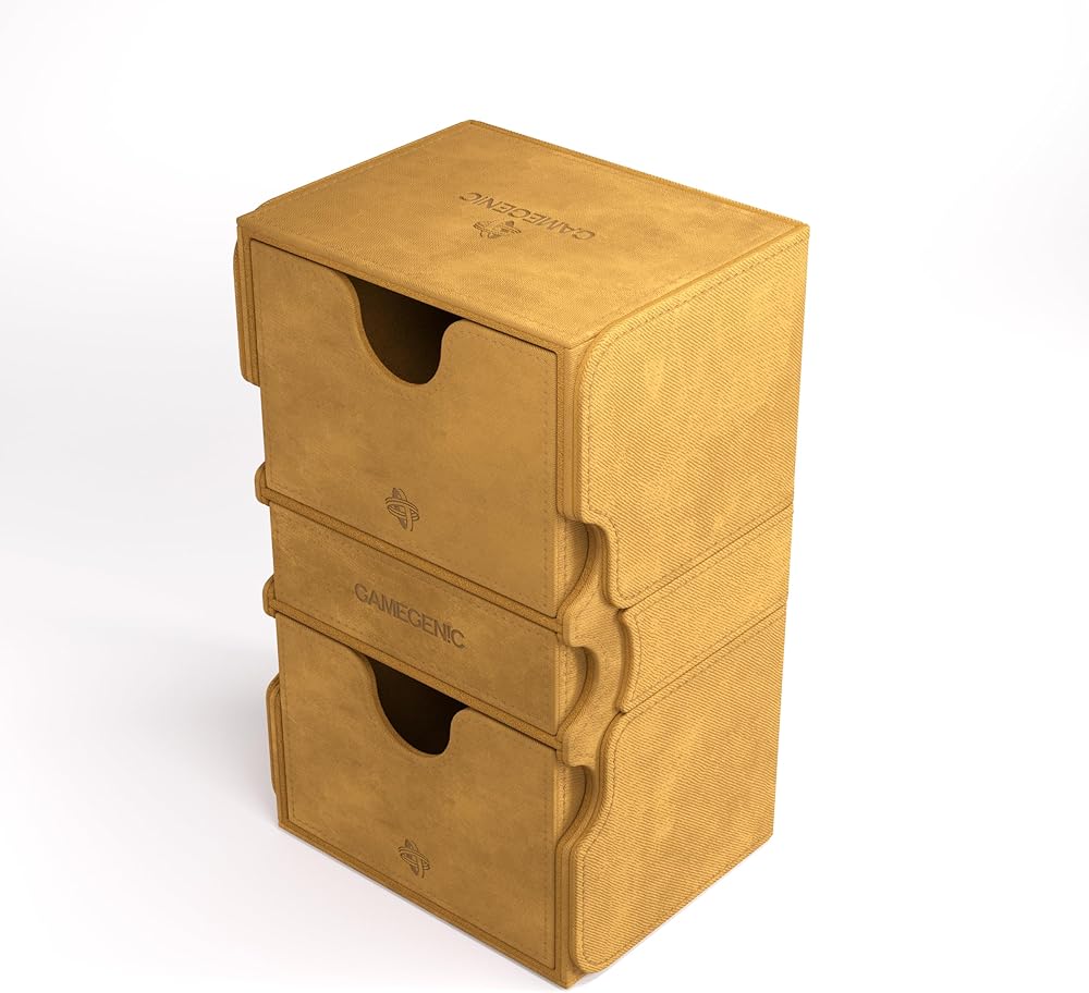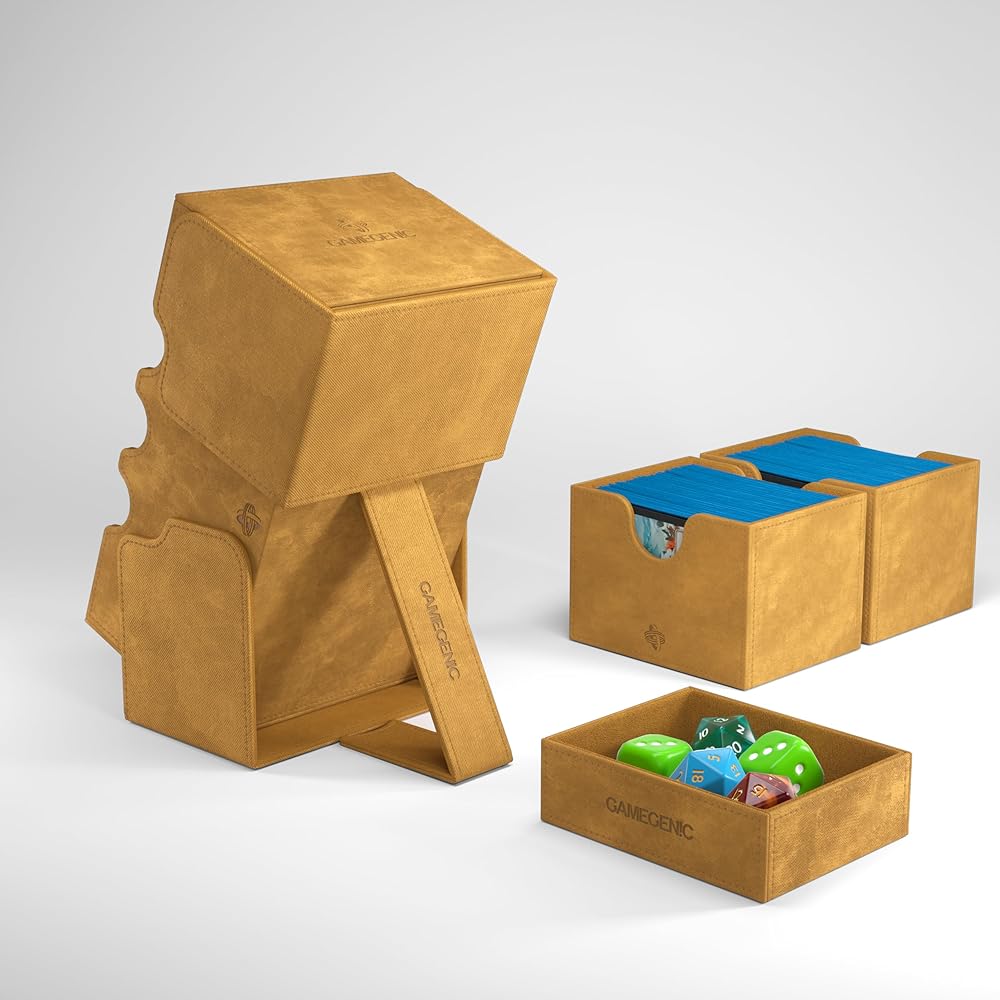 “These walls will defend even more treasures.“ – Many customers have been waiting for it: our highly-rated XL boxes in a new color - SAND! TOP FEATURE: Made to fit 200 double sleeved cards in extra Thick Inner Sleeves. Elegant outside material in Nexofyber with soft microfiber lining. Two removable card holders keep up to 200 double-sleeved cards in this large and extremely robust deck box. Just like other Convertible products, its flaps are removable and can be clipped to the back side of the box to save space at the gaming table. Powerful magnets ensure a safe closure.