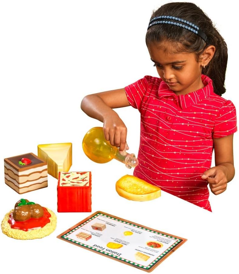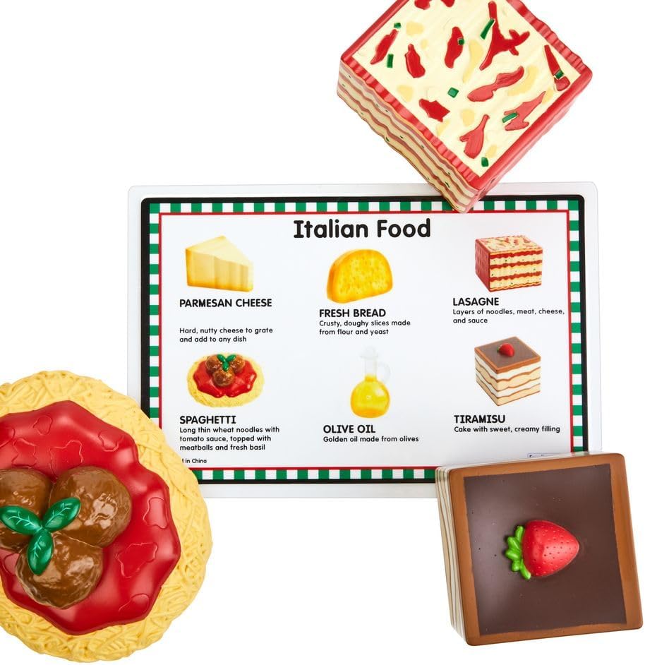 *REALISTIC FOOD FUN: PVC Vinyl molded food pieces are sized, textured, and colored just like real food. Everything looks good enough to eat! *MENU INCLUDED: Set includes a laminated full-color menu with photographs and brief description of each item. *A BOUNTIFUL BANQUET: Italian -1 Bread Slice, 1 Parmesan Cheese Wedge, 1 Olive Oil Cruet, 1 Spaghetti with meatballs, 1 Lasagna, 1 Tiramisu and menu *EASY TO CLEAN. All foods are made of soft, durable molded PVC vinyl plastic that's easy to sanitize.