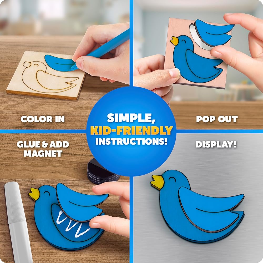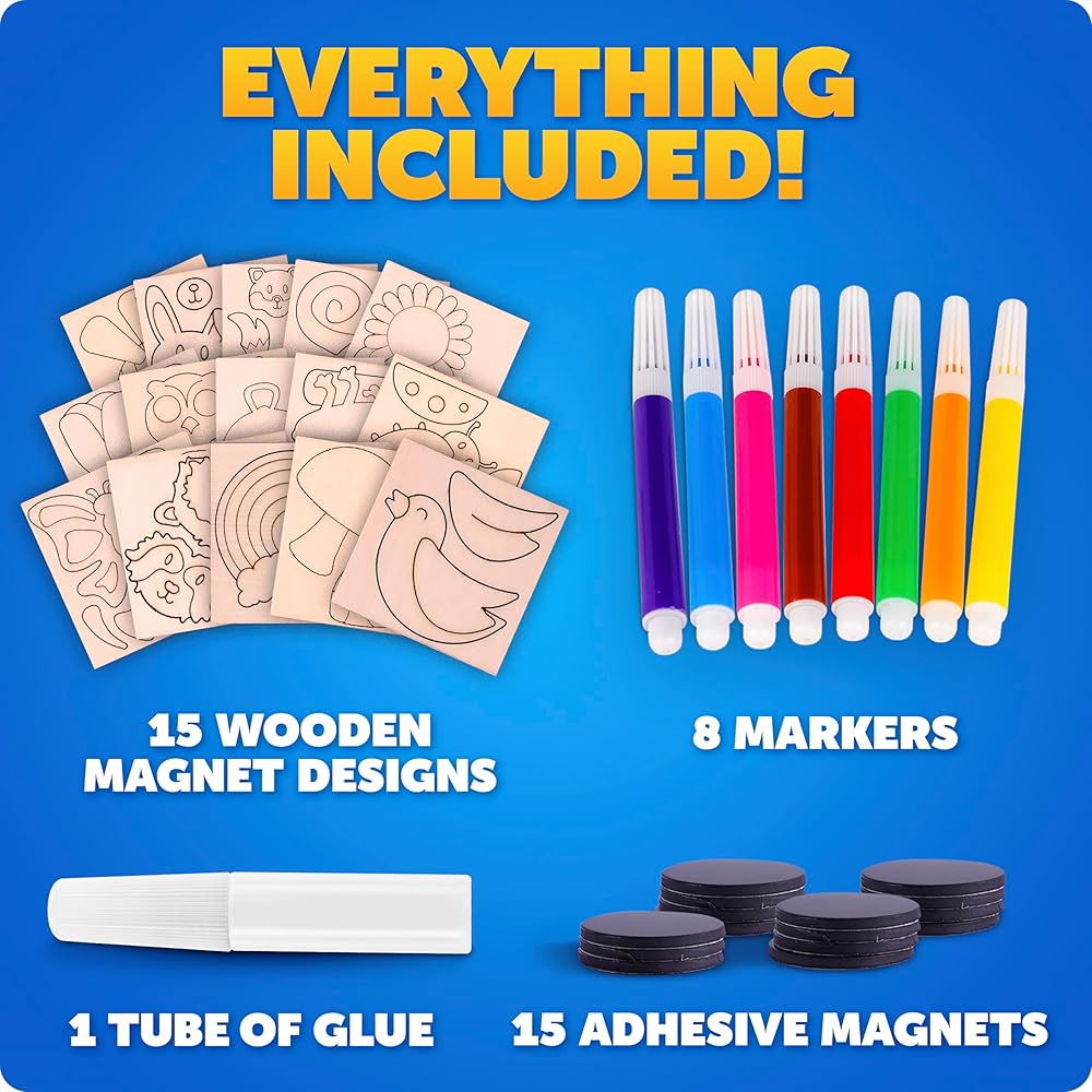 اصنع وتزيين 15 مغناطيسًا - تحتوي هذه المجموعة الحرفية الممتعة للغاية على كل ما يحتاجه الأطفال لتلوين وتجميع 15 مغناطيسًا خشبيًا ثلاثي الأبعاد بطابع طبيعي! يمكن للأطفال استخدام الأقلام الثمانية المضمنة لتلوين 15 قطعة خشبية بأي طريقة يحبونها للتعبير عن إبداعهم!