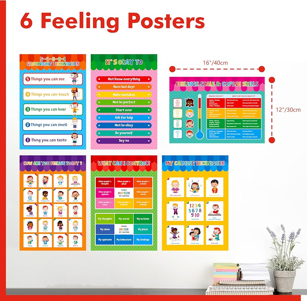 6 قطع من مخطط المشاعر، ملصقات زاوية مهدئة مع ملصقات علاج للصحة العقلية من فيلم PET، ملصق للرفاهية النفسية لآليات التكيف وإدارة الإجهاد، استخدام المكتب المنزلي (16 بوصة × 12 بوصة)