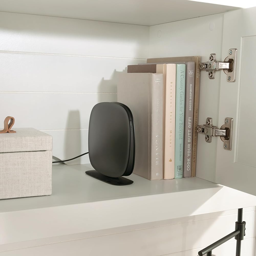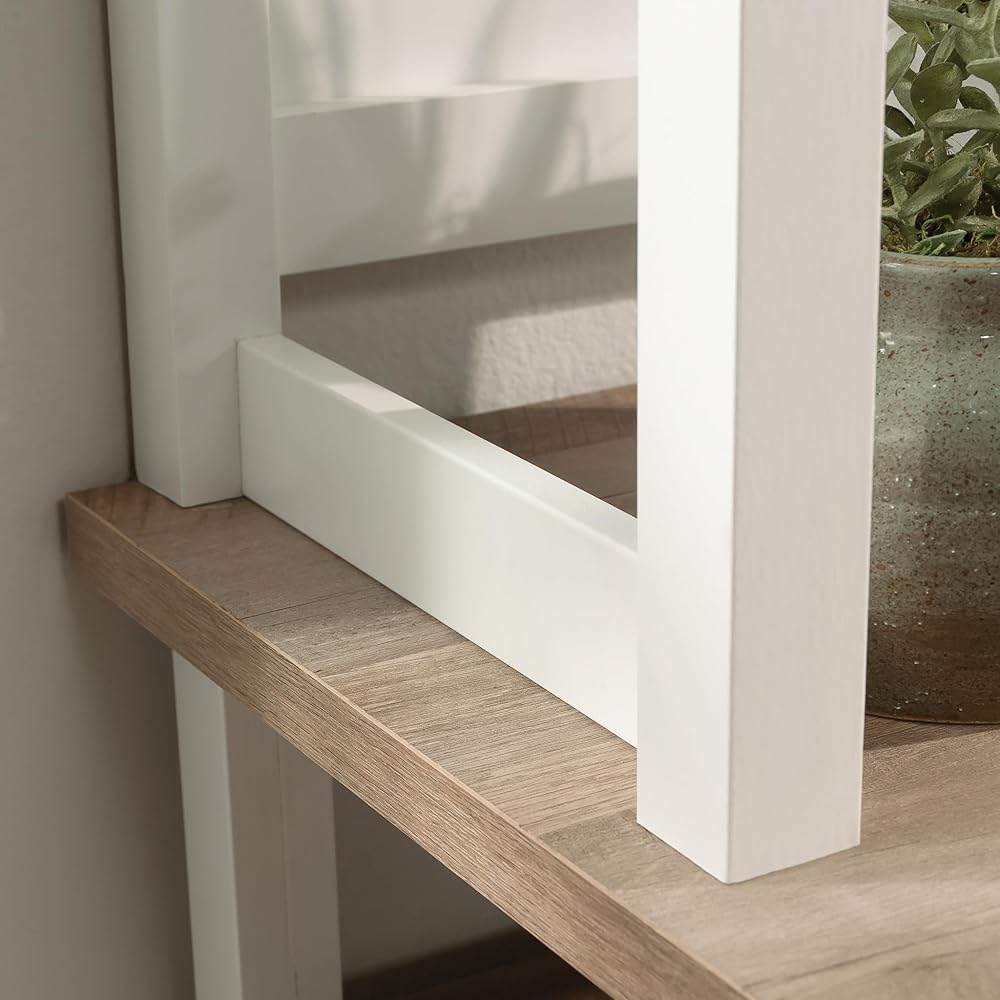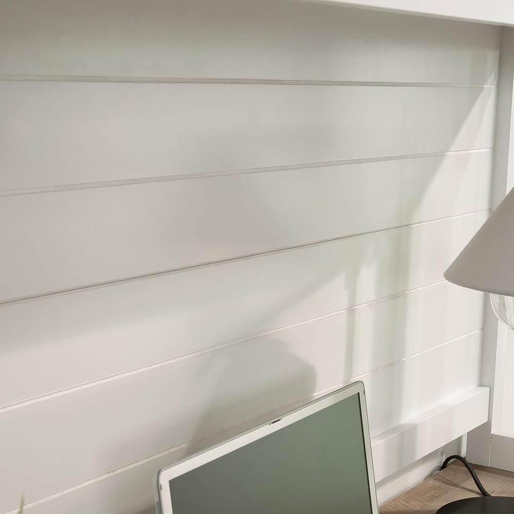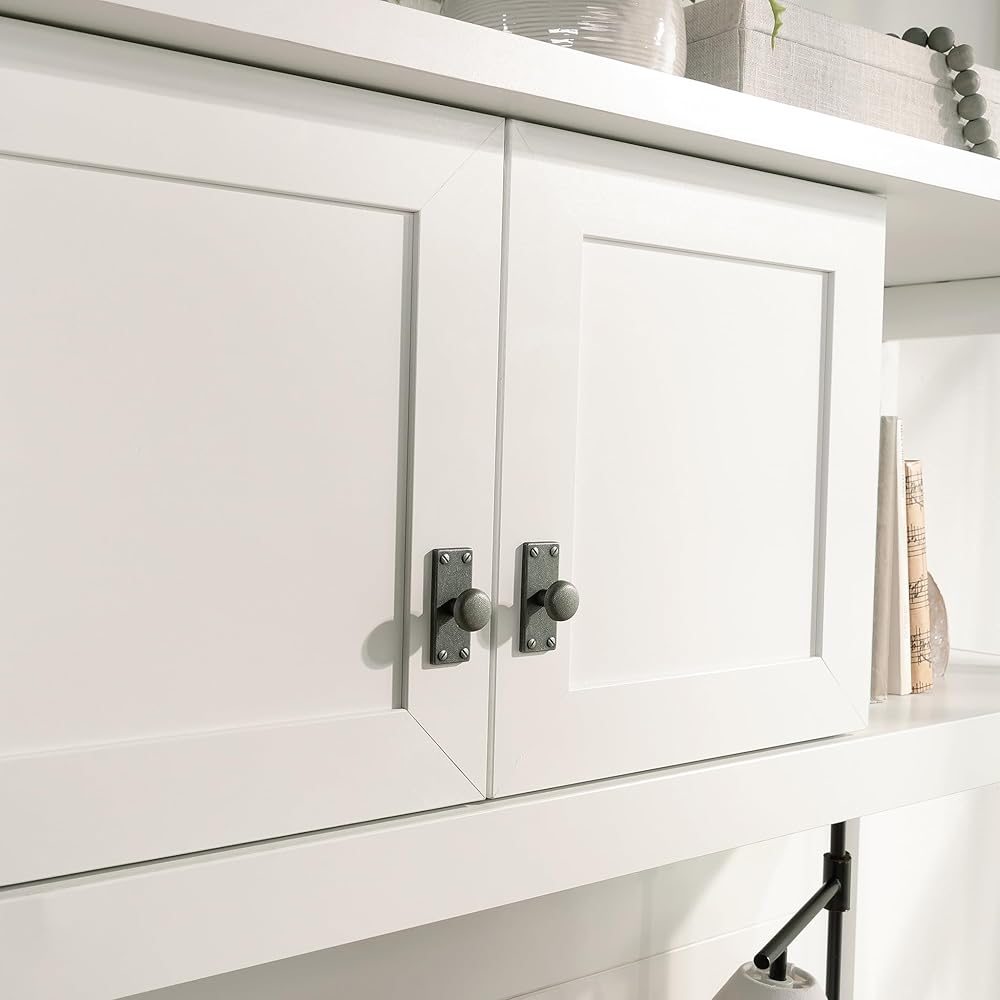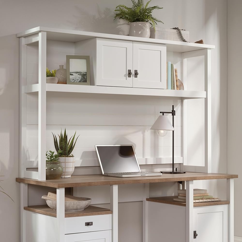 Add an extra touch of fashionable style and convenient storage to your home office décor with this desktop hutch from the Cottage Road® collection. This handy desktop hutch organizer easily attaches to Desk 430056 to give your home office or workspace a completed look. This cottage-inspired hutch for desk has open end panels and features a storage area behind the double doors – a space ideal for anything that needs hidden away. It also includes open shelving to hold items like a decorative plant, books, binders, and framed photos of loved ones. Use the 1" thick top surface as a gallery display shelf, and this office hutch with storage has room for a lot of stuff. Finished in white and accented with squared framing and bead board paneling, this storage hutch for desk adds an elevated style, functionality, and statement piece to any home office setting.