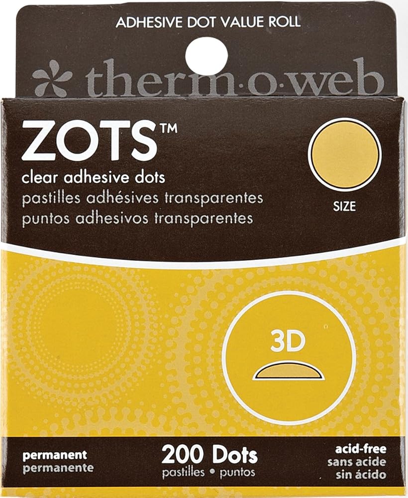 Zots are available in a variety of permanent sizes (3/16 by 1/64-inch (300), 3/8 by 1/64-inch (300), 1/2 by 1/64-inch (300), 1/2 by 1/16-inch (250), 1/2 by 1/8-inch (200), 3/8 by 1/64-inch (200), repositionable, and all are acid free, clear double-sided, high-tack, and form an instant bond with photos, paper, acetate, plastic, glass, chipboard, fabric, yarn, thread, ribbon, wood, and much more for scrapbooking, card making, paper crafting, home decor, and more. All Zots products are acid-free, archival, and conform to ASTM D4236. Made in USA.
