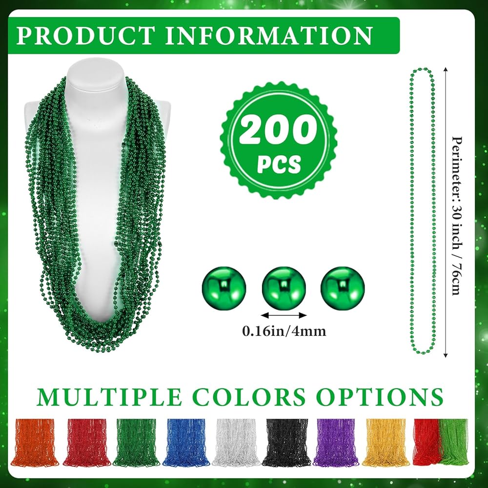 • Abundant Quantity for Wide Application: with 200 pieces of green bead necklaces in the package, you can easily decorate an area or share them with your friends and family; They are good for Mardi Gras parties, Halloween parties, festival parades throw, birthdays, weddings, and other festive occasions; Enough necklaces to make sure that you will not worry about running out of them during the party; You can use them to decorate your home, office, or other places you want