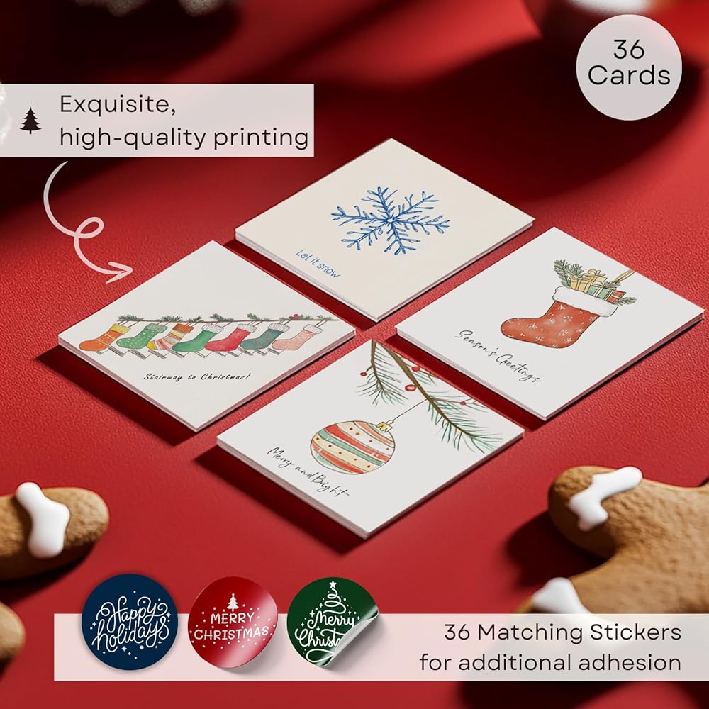 • بطاقات عيد الميلاد المعبأة: ضرورة احتفالية! تحتوي هذه المجموعة على 20 بطاقة (5 من كل تصميم)، و24 ملصقًا متطابقًا، ومغلفات سهلة الغلق، وصندوق تخزين احتفالي للحفاظ على كل شيء مرتبًا. إنها المجموعة الكبيرة المثالية لنشر البهجة على العائلة والأصدقاء والزملاء