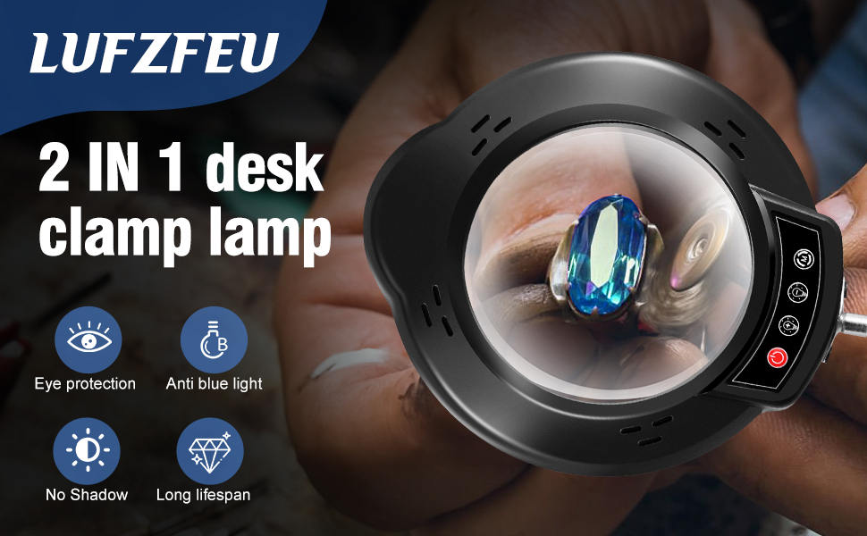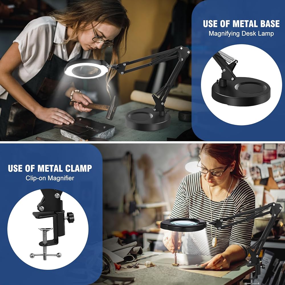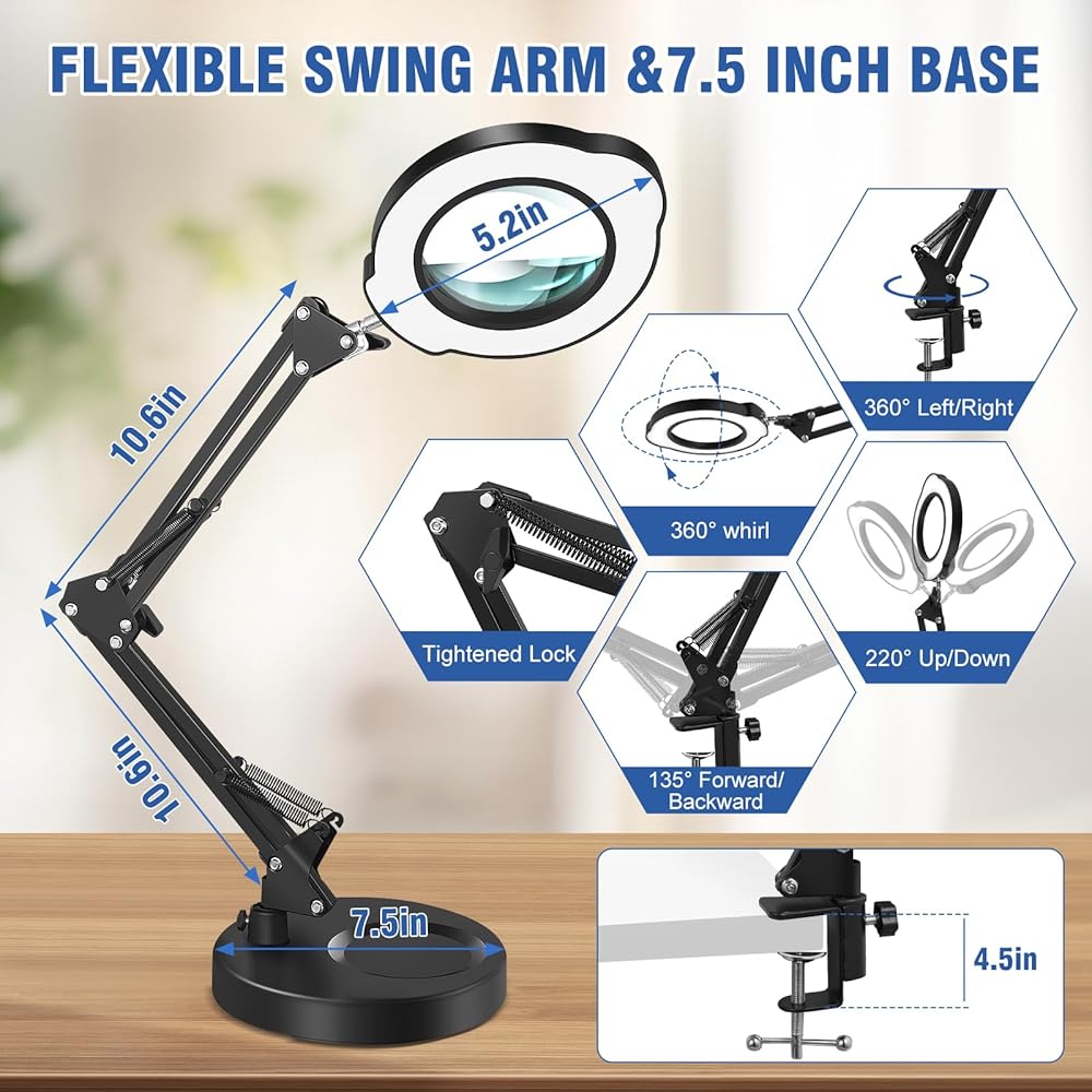 【عدسة مكبرة 2 في 1 مع ضوء ومشبك】- مصباح النظارات المكبرة مجهز بقاعدة معدنية دائرية شديدة التحمل يصل قطرها إلى 7.5 بوصة لضمان الثبات أثناء الاستخدام. لا توفر هذه القاعدة دعمًا قويًا فحسب، بل تعمل أيضًا كمنصة عمل عملية. تأتي العدسة المكبرة المزودة بالضوء أيضًا بمشبك قوي مقاس 2.1 بوصة يسمح لك بربطها بمجموعة متنوعة من الأسطح المسطحة، بما في ذلك الطاولة أو طاولة العمل أو المكتب. يجمع هذا التصميم بذكاء بين الاستقرار وسهولة الحمل.