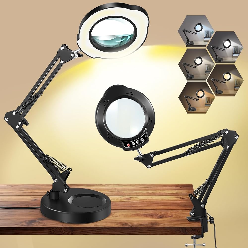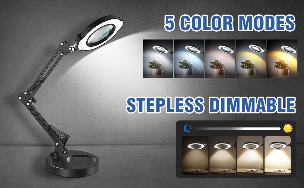 عدسة مكبرة 10 مرات مع ضوء ومشبك، قاعدة مستديرة 2 في 1 ومصباح مكبر بمشبك مع ذراع متأرجح قابل للتعديل، 5 أوضاع ألوان قابلة للتعتيم بدون خطوات، لهواية الحرف اليدوية، قراءة إصلاح اللوحة، الخياطة القريبة