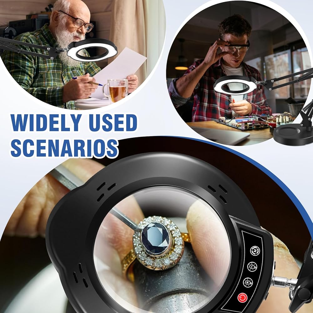 【الثبات والدقة】- تم تجهيز هذه العدسة المكبرة المزودة بالضوء والمشبك بقاعدة دائرية صلبة لضمان الثبات أثناء الاستخدام ومنع الإمالة أو الانزلاق بشكل فعال. تصميم الذراع المتأرجح المرن يجعل ضبط الزاوية سهلاً ودقيقًا. يمكن للمستخدمين وضع الأضواء بسهولة دون القلق بشأن الارتداد، مما يسمح لك بالتركيز على الأعمال الجيدة مثل الطلاء وفحص العملات المعدنية والمقتنيات والرسم المصغر ونحت الخشب ولحام لوحة الدائرة وإصلاح الساعات.