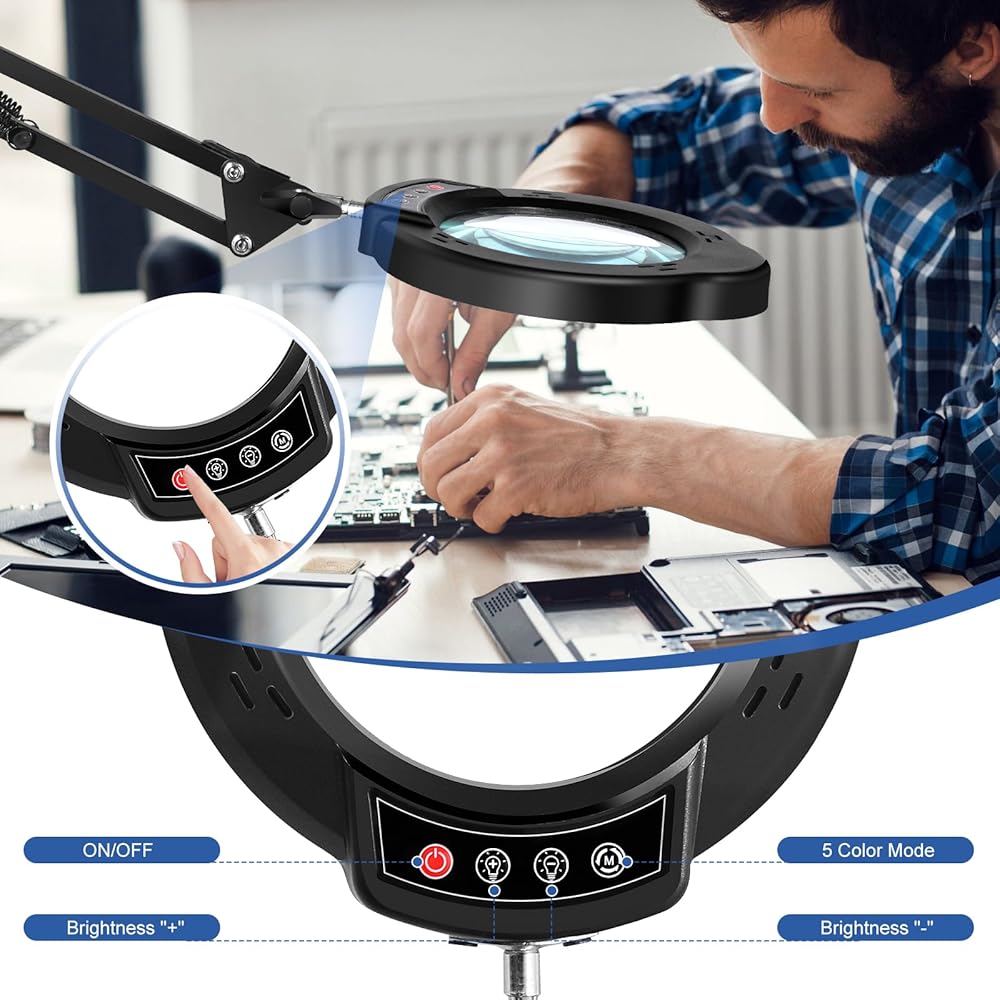 【موضع تبديل مريح】- قل وداعًا للإحباط الناتج عن الإعدادات المعقدة! تتميز العدسة المكبرة ذات الضوء والمشبك للعمل القريب بمفتاح سهل الاستخدام يتم وضعه مباشرة على رأس مصباح العدسة المكبرة. تتيح لك النقرة البسيطة ضبط السطوع بسلاسة، مما يسمح لك بالتركيز على مهمتك دون أي تشتيت. تسمح العدسة المكبرة المزودة بالضوء والمشبك بسهولة التشغيل والتعديل. يتيح المصباح الزجاجي المكبر سهولة التشغيل والتعديل.