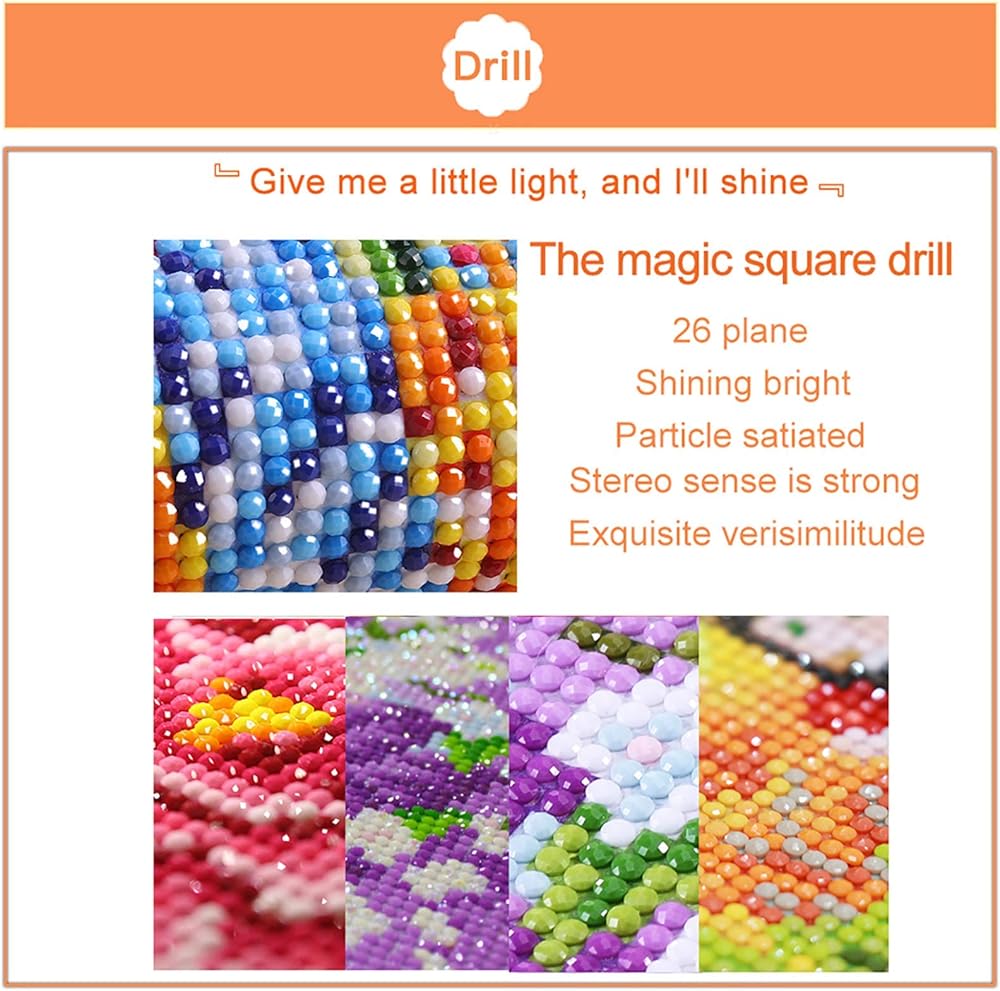 【مادة حماية البيئة】 طباعة عالية الدقة 5D، شبكة شفافة، قماش زيتي مقاوم للماء، نسيج رائع، وقت حفظ طويل. صمغ ساخن صديق للبيئة، قوة لاصقة قوية، بدون حفر. مثقاب مربع سحري عالي الجودة، 26 قسمًا، لامع ورقيق، لصق المنتج النهائي بتأثير رائع، إحساس قوي بالتسلسل الهرمي.