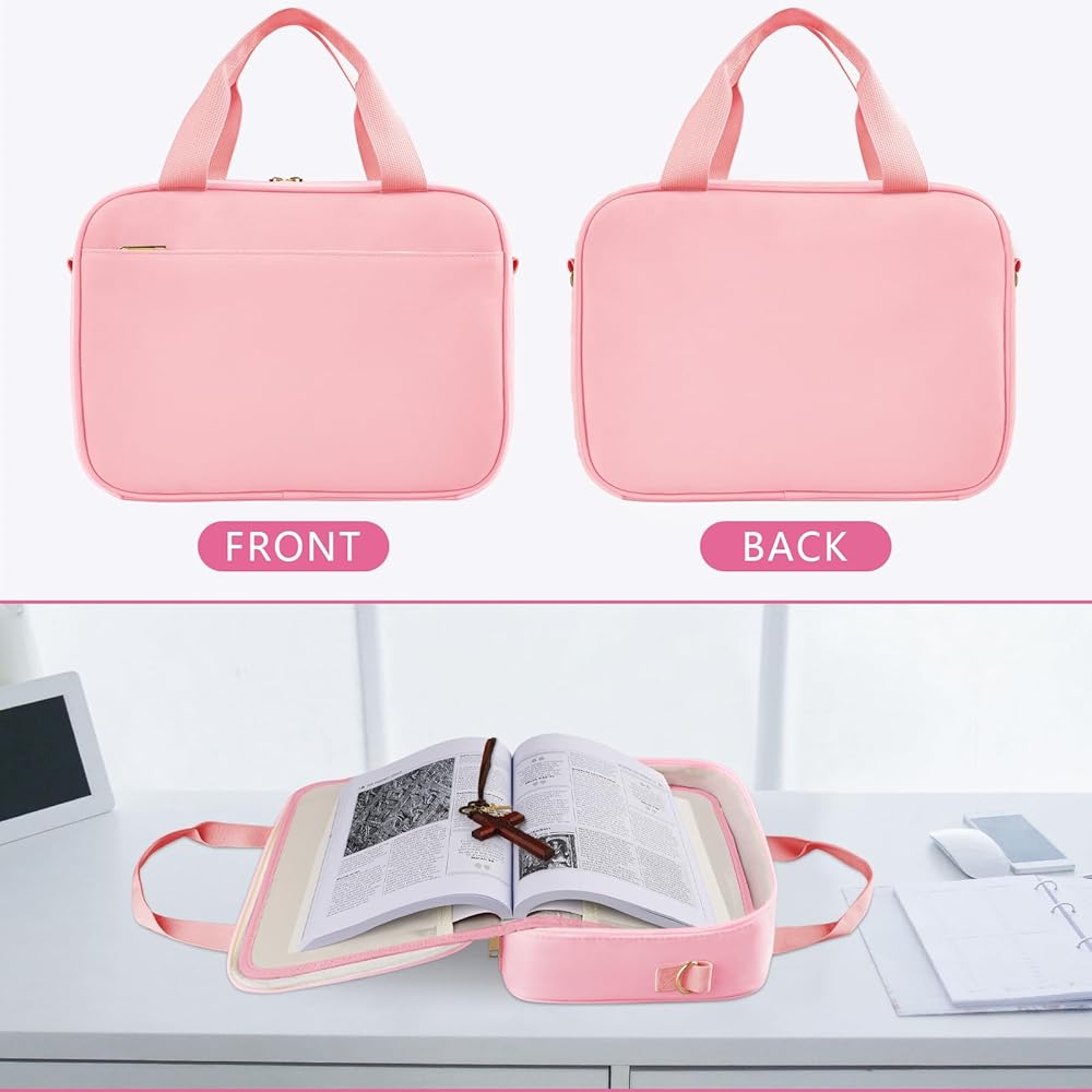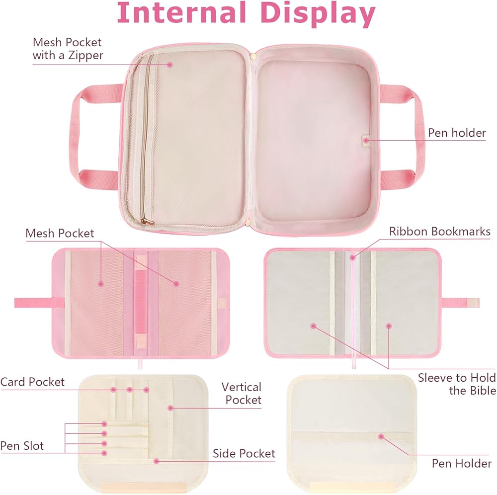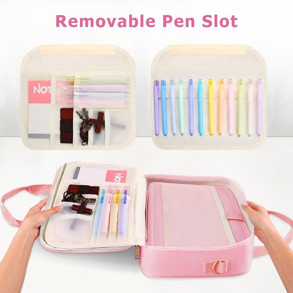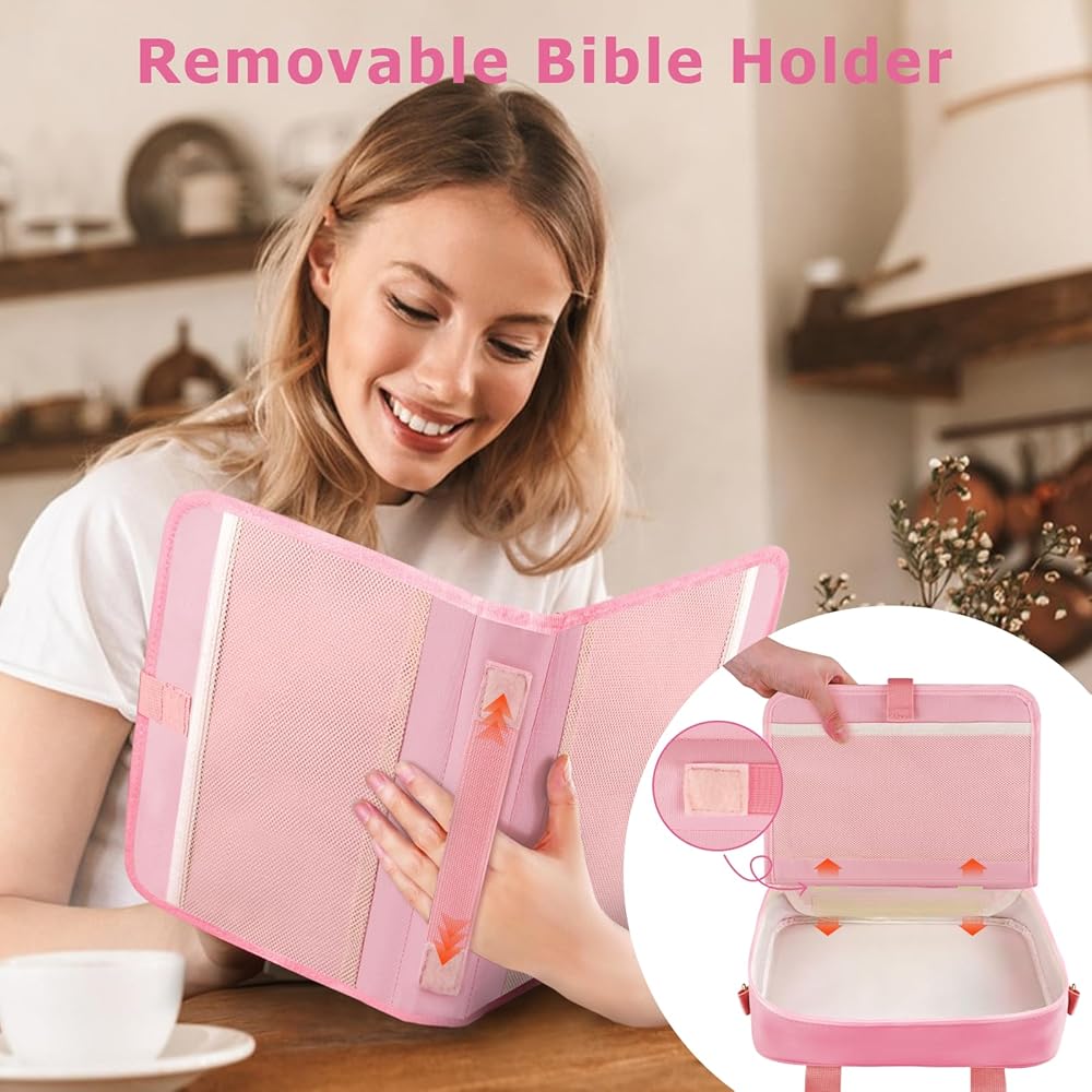 أغطية الكتاب المقدس للنساء والفتيات، حقيبة كبيرة للكتاب المقدس باللون الوردي مع حامل للكتاب المقدس قابل للفصل وحزام كتف بفتحة قلم، حقيبة حمل من القماش للكنيسة للكتب المقدسة ذات الحجم القياسي، هدية مثالية لمحبي كتب المسيحيين
