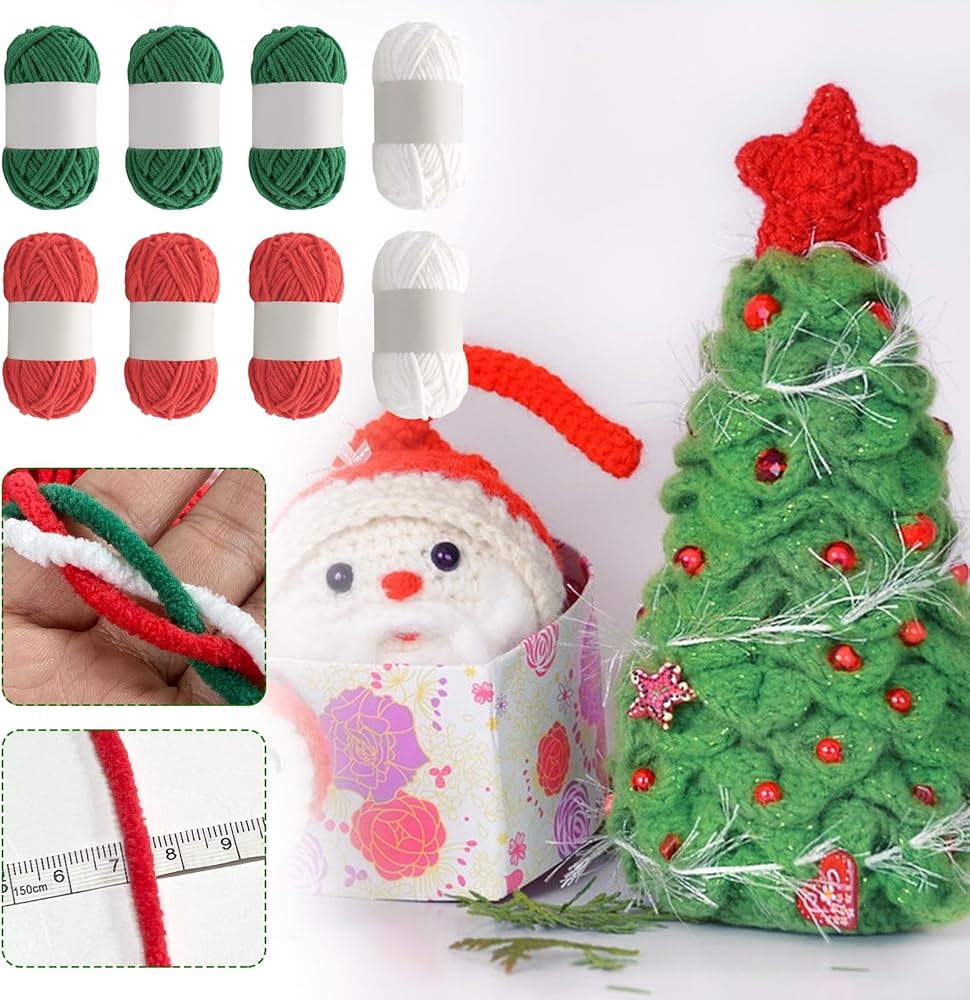 Rainmae 8 Pack Christmas Chenille Yarn, Christmas Chunky Knitting Crochet Velvet Yarn Knitting Yarn for Xmas DIY Craft Handmade Scarf Hat Christmas Stocking Decoration (White, Green, Red)