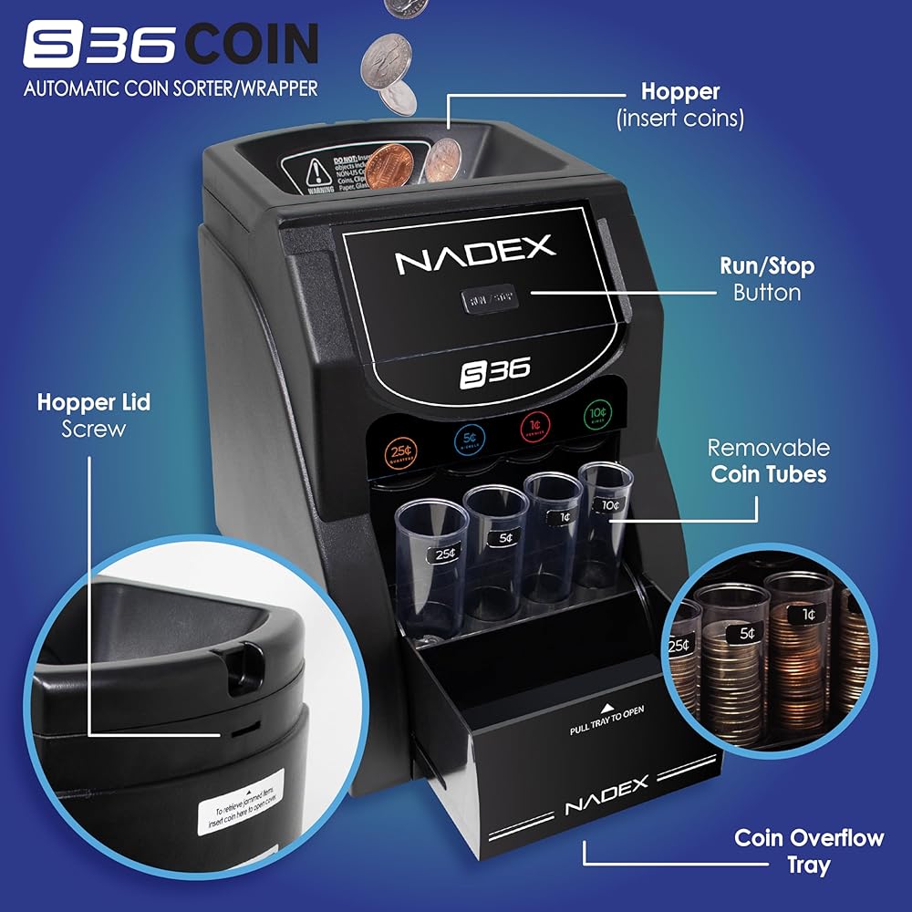 ماكينة فرز العملات المعدنية الأوتوماتيكية Nadex 36SR - تقوم بفرز ما يصل إلى 200 قطعة نقدية في الدقيقة. ما عليك سوى الضغط على زر التشغيل ومشاهدة العملات المعدنية منفصلة في كل أنبوب من الفئات - مما يوفر ساعات من الوقت والجهد المبذول في الفرز يدويًا!