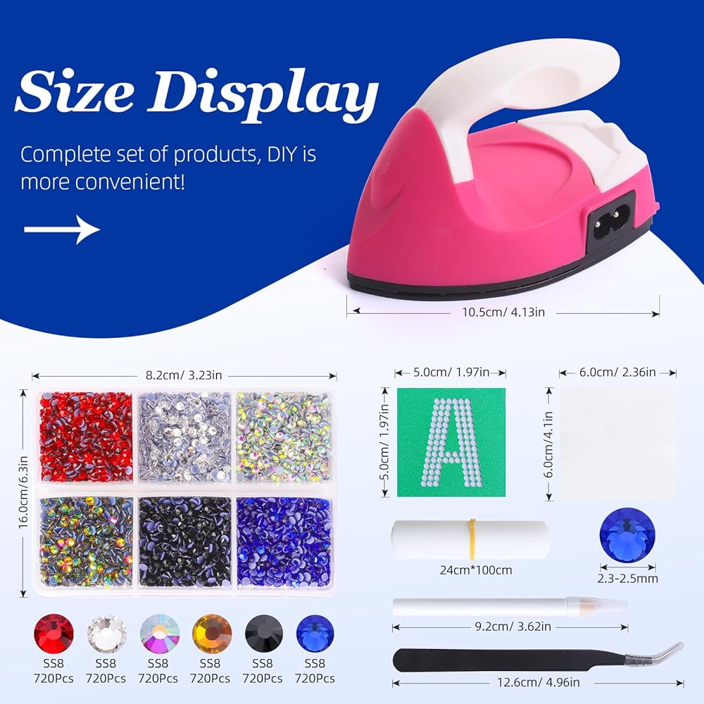 مجموعة حديد فاخرة من أحجار الراين للإصلاح العاجل: تتضمن مجموعة حديد تطبيق حجر الراين الإصلاح العاجل كل ما تحتاجه لبدء مشروعك اللامع، مثل أداة تطبيق الإصلاح العاجل الحديدي، وقوالب مكونة من 26 حرفًا وبعض الرموز التعبيرية، وإسفنجة يمكن أن تساعدك على رصف أحجار الراين، 100 ورقة من ورق النقل، وصندوق مكون من 6 ألوان بإجمالي 4320 حجر الراين، وقلم التقاط وملقاط.