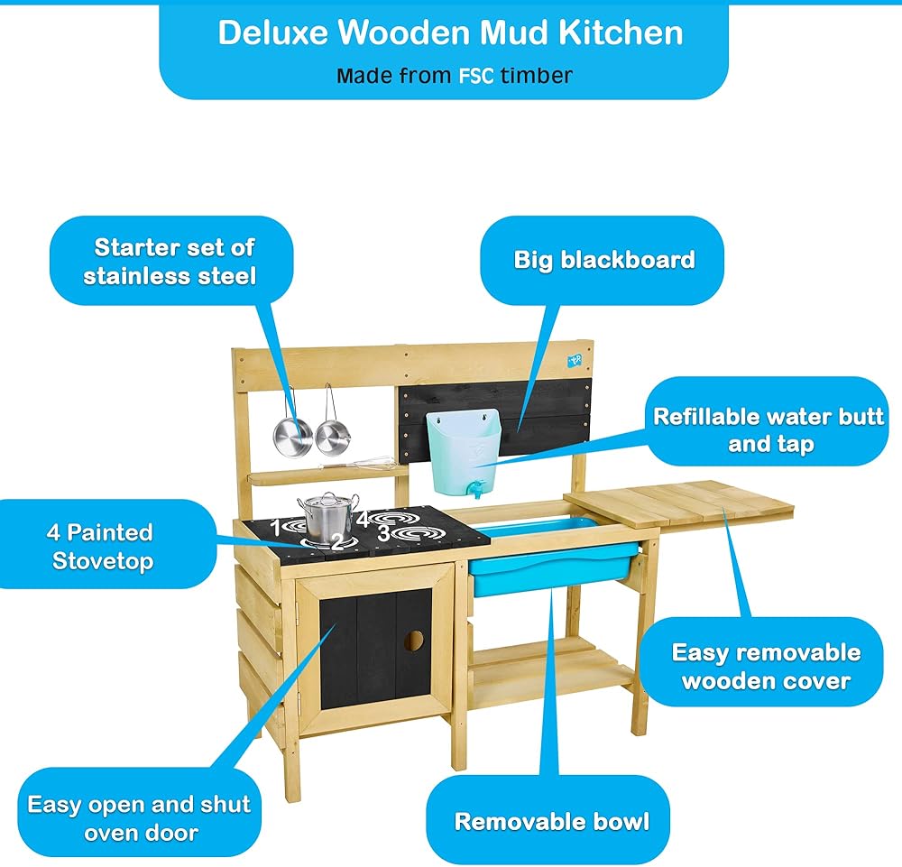 تي بي تويز، مطبخ الطين الخشبي الفاخر للأولاد والبنات من عمر 3 إلى 8 سنوات | مجموعة لعب المطبخ الخارجي للأطفال مع مقلاة رمل ومياه، وحوض لعب، وإكسسوارات المطبخ | اللعب التظاهري الممتع في الفناء الخلفي للأطفال الصغار.