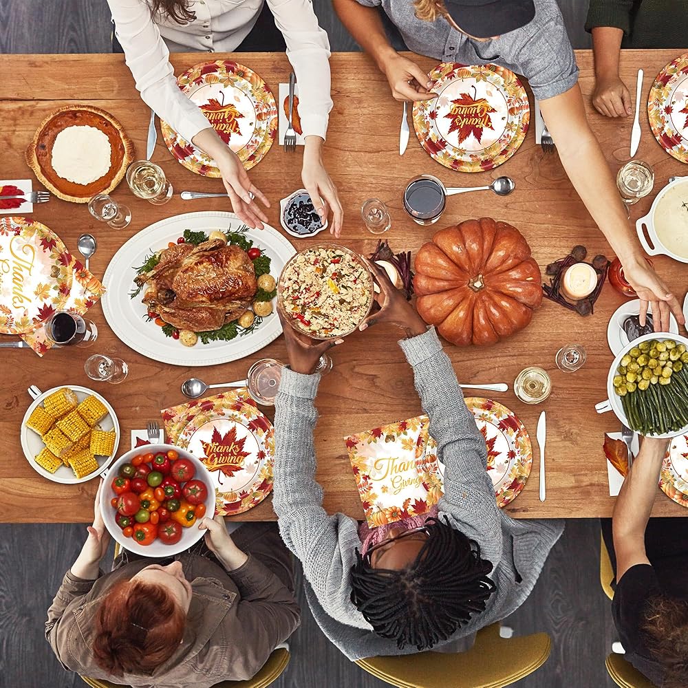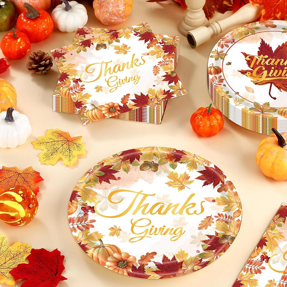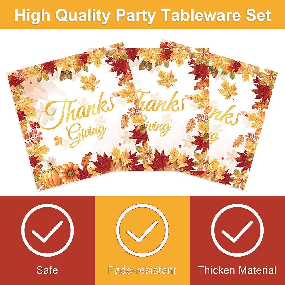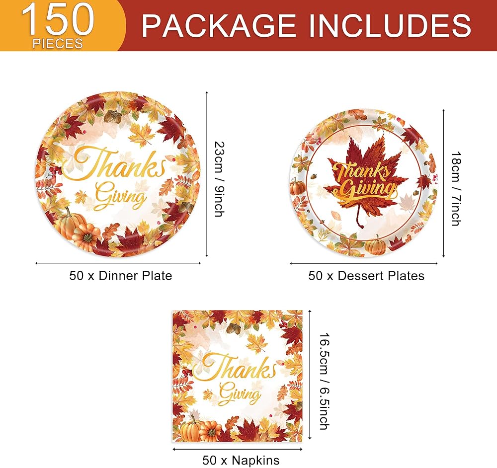 مجموعة لوازم حفلات عيد الشكر تتضمن لوازم حفلات الخريف أطباق العشاء وأطباق الحلوى والمناديل لتقديم الشكر وأوراق القيقب وديكورات الحفلات تكفي 50 (150 قطعة)