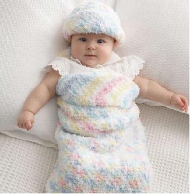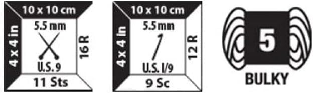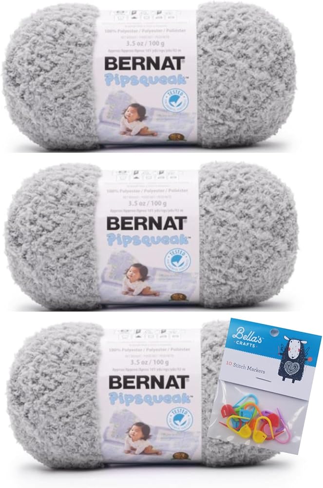 Bernat Pipsqueak Yarn. A soft chunky weight yarn that knits and crochets up quickly. Ideal for kids and babies. Weight category: 5. Content: 100% polyester. Putup: 3.5oz/100g, approximately 120yd/109m. Gauge: knit: 11st x16r = 4in/10cm on size US9/5.5mm needles, crochet: 9sc x 12r = 4in/10cm on size I9/5.5mm hook. Dyelotted: we try but are not always able to match dye lots. Care: machine and dry, do not bleach, do not iron, dry cleanable.