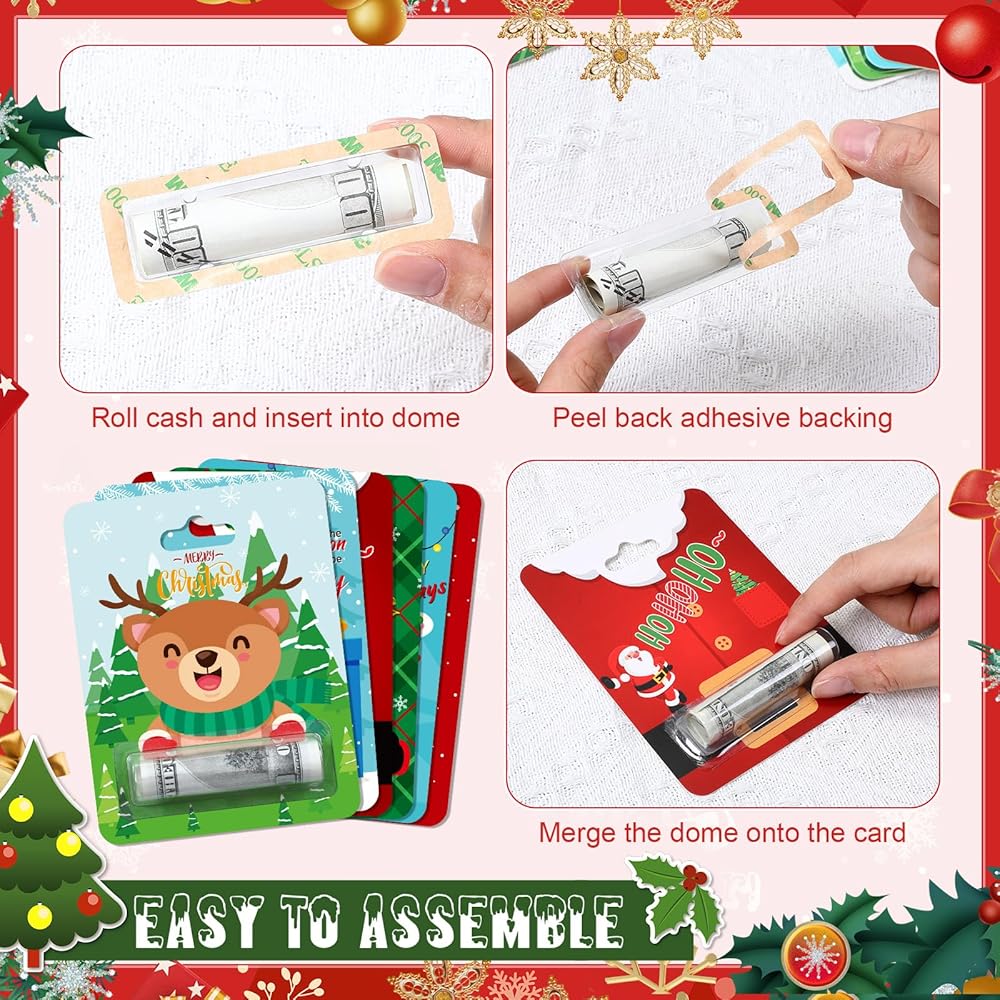 سهولة الاستخدام: قم بلف النقود أو الشيكات أو قسائم الهدايا وضعها في المحافظ البلاستيكية؛ مع سهولة تقشير اللاصق، قم بلصق المحفظة على حامل نقود عيد الميلاد الخاص بنا، مما يوفر لك طريقة سهلة ومريحة لإعداد هدايا عيد الميلاد
