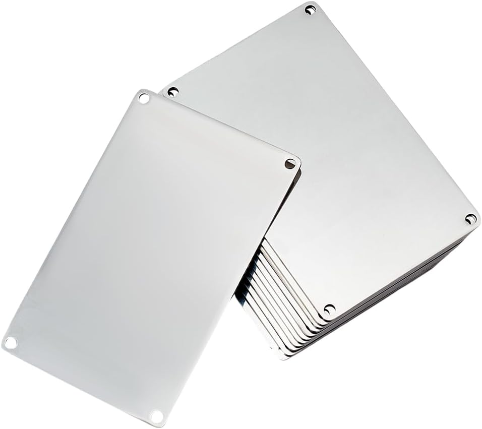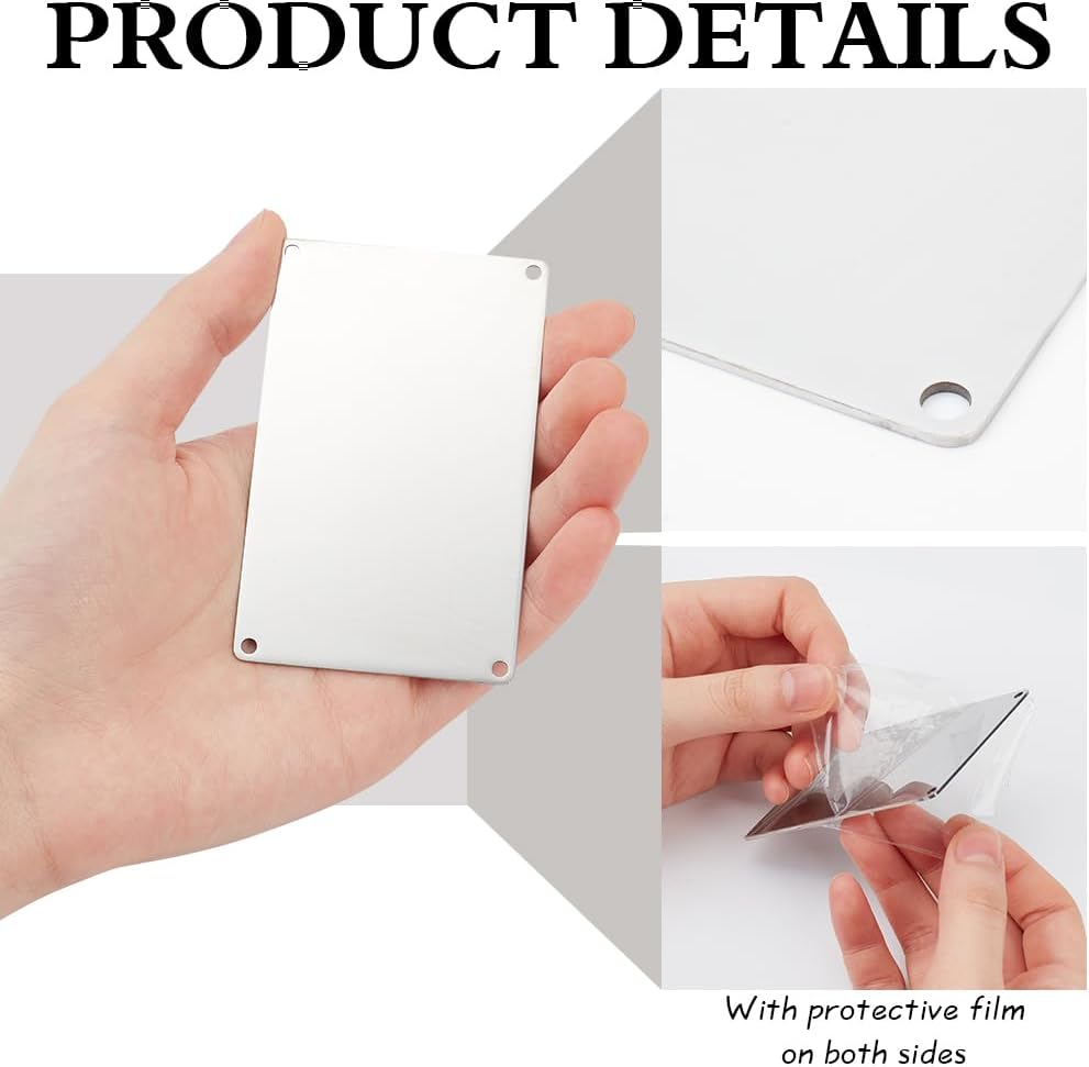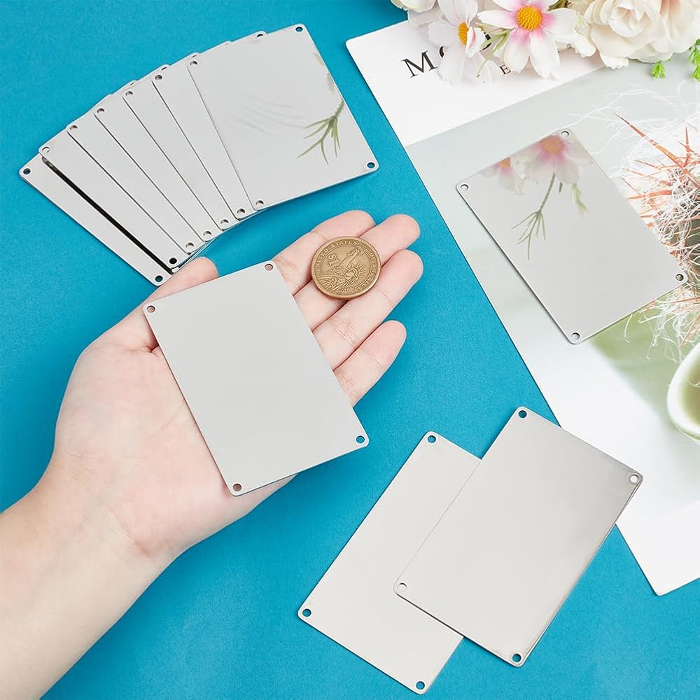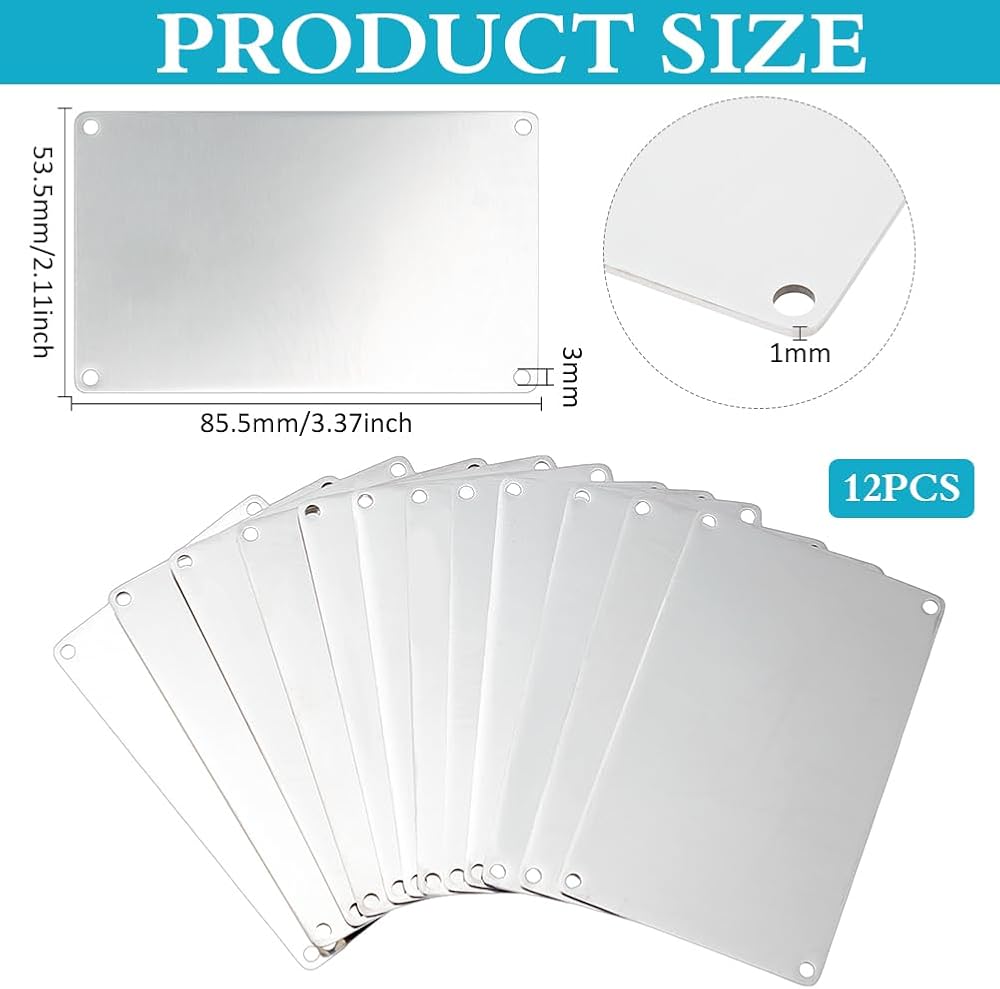 Package Includes: 12 pcs 304 stainless steel rectangle blanks with four holes, is 8.55x5.35cm/3.4x2.1 inch, 1mm thick, hole 3mm