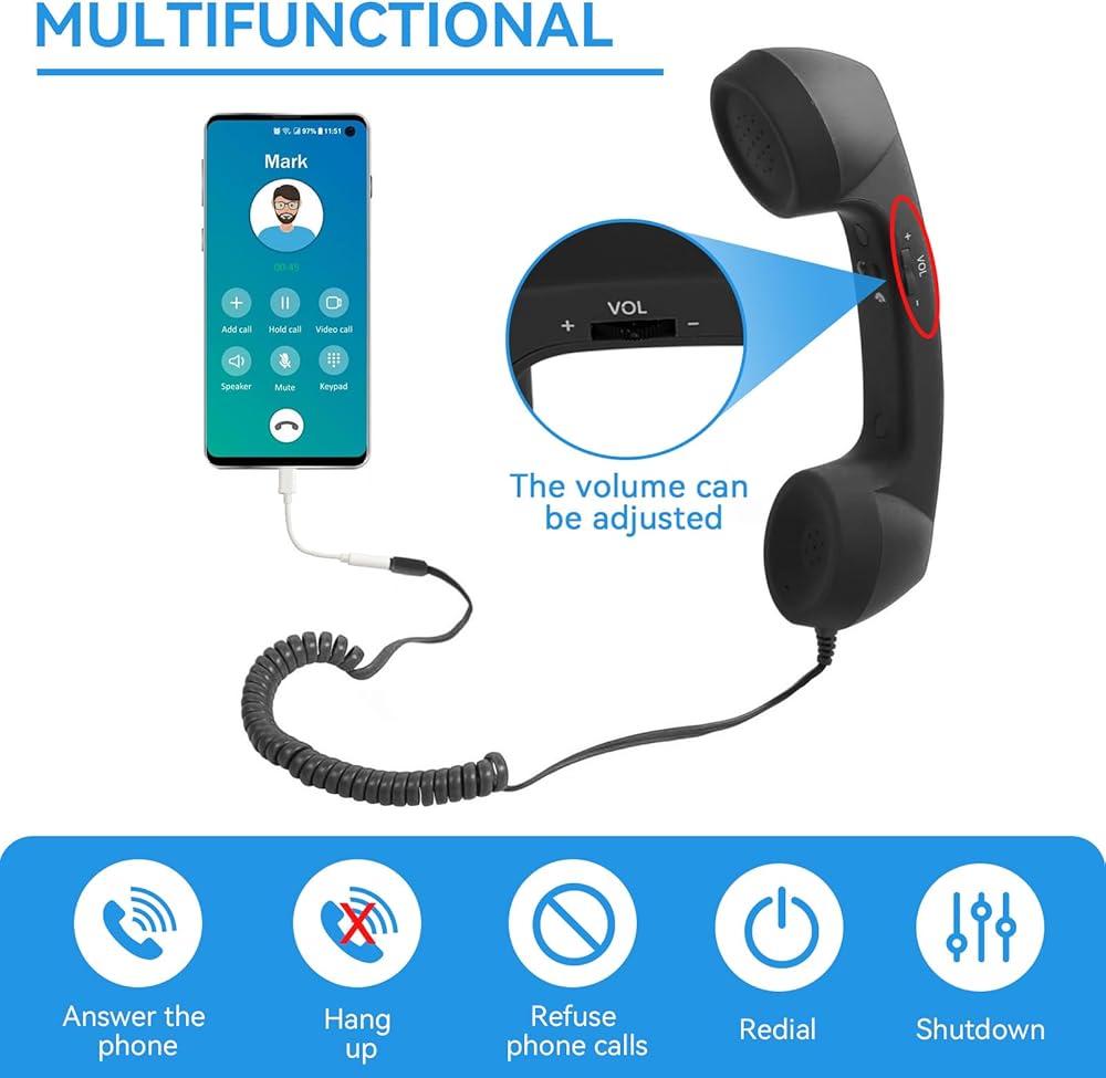 متعددة الوظائف: يمكن استخدام سماعة الهاتف المحمول، سماعة الهاتف القديمة للرد على مكالمة، وتعليق مكالمة، ورفض مكالمة، وإعادة الاتصال، وإيقاف التشغيل، وما إلى ذلك. يمكن تعديل سماعة الهاتف لحجم صوت الهاتف المحمول.