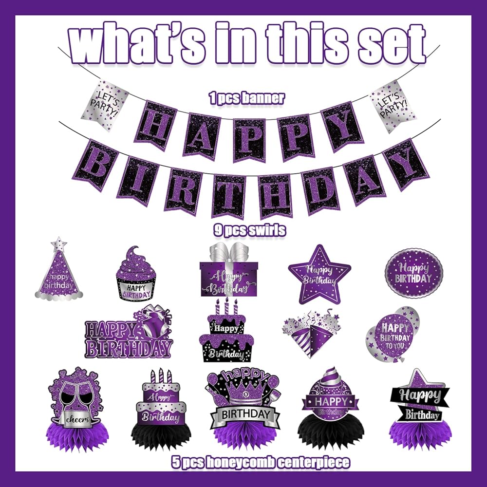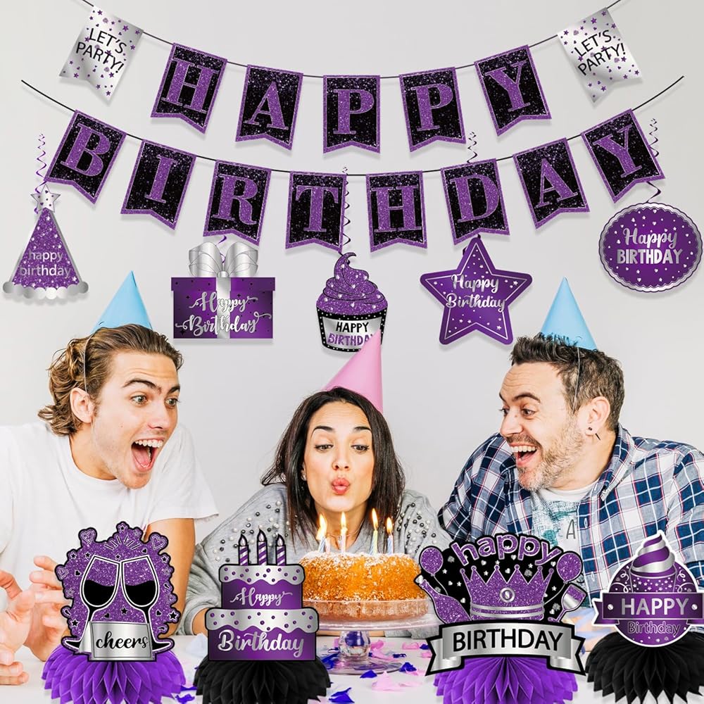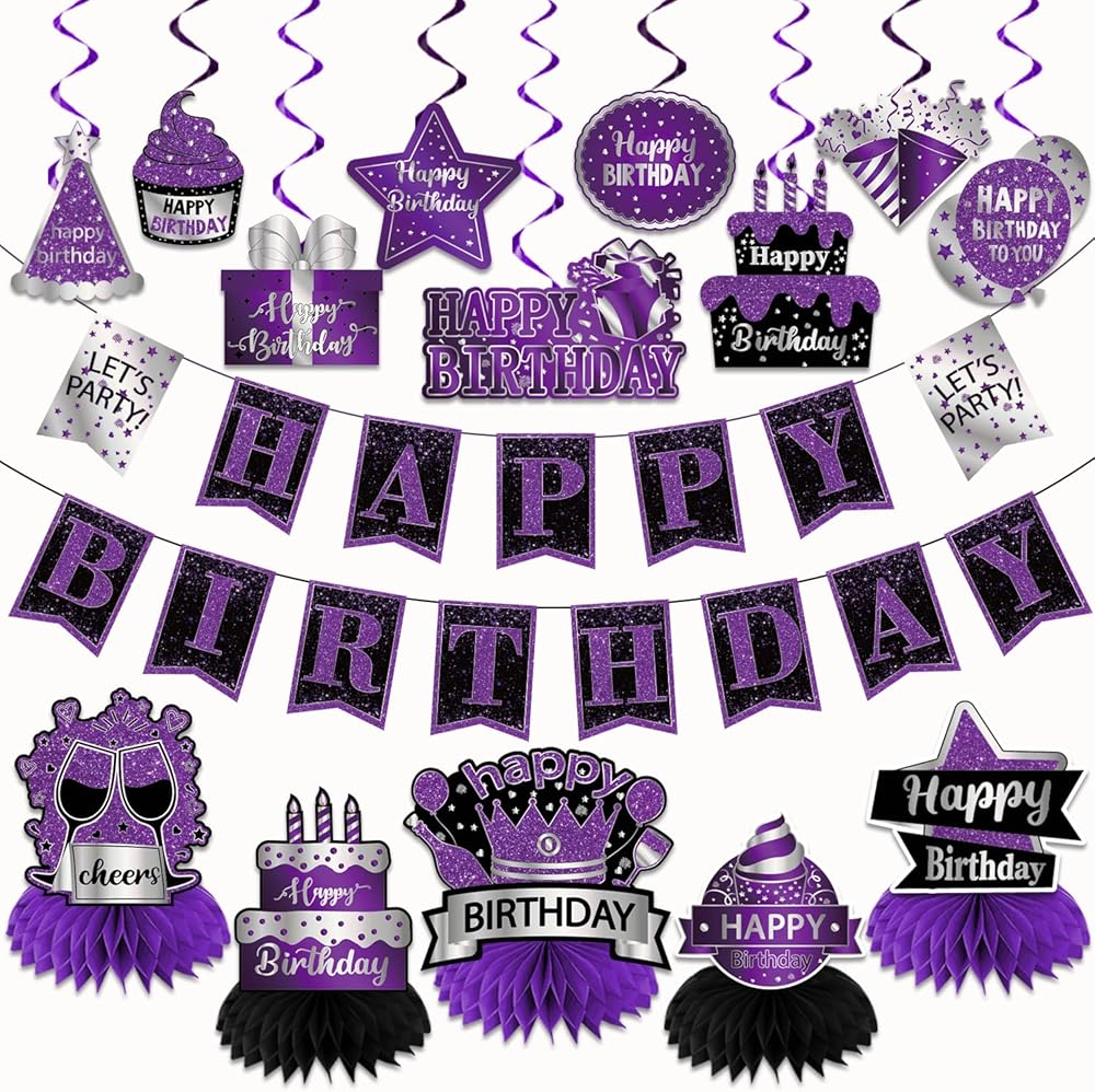 زينة حفلة عيد ميلاد أرجوانية، زينة عيد ميلاد للنساء تتضمن لافتة عيد ميلاد سعيد، ودوامات معلقة وقطع مركزية على شكل قرص العسل، وديكورات أرجوانية لمستلزمات الحفلات