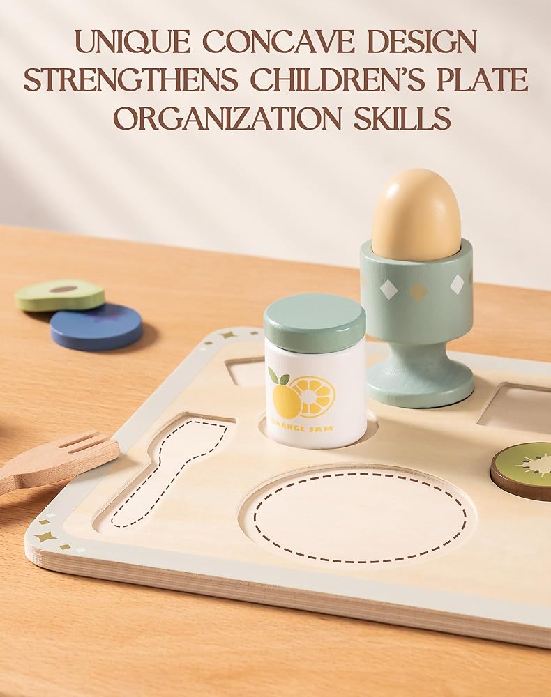 【تصميم مطابق فريد من نوعه】تتميز مجموعة طعام اللعب الخشبية من ROBUD بتصميم مقعر فريد على كل قطعة يتوافق تمامًا مع طبقها المطابق، مما يساعد الأطفال على ممارسة الفرز والتخزين مع تعزيز مهاراتهم التنظيمية.