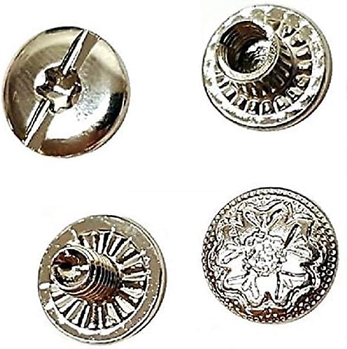 New 10 Pack Premium 3/8" Nickel over Brass Floral Engraved Chicago Screws. The Chicago Screws *Makes 10 complete assemblies. The 10 pc set Includes: 10 Male Screws and 10 Female Posts of high quality durable nickel plated brass. The threaded post lets you open and re-attach piece where needed Great for: All leather crafting applications, Horse saddle-tack repair, gun belts, holsters, shoes, bags, chaps motorcycle gear and much more **A must have in you kit for quick repair. *Head Diameter is 3/8" *Female Post Diameter is 3/16" *Female Post Length is 3/8" By Hill Leather