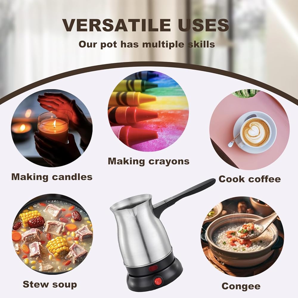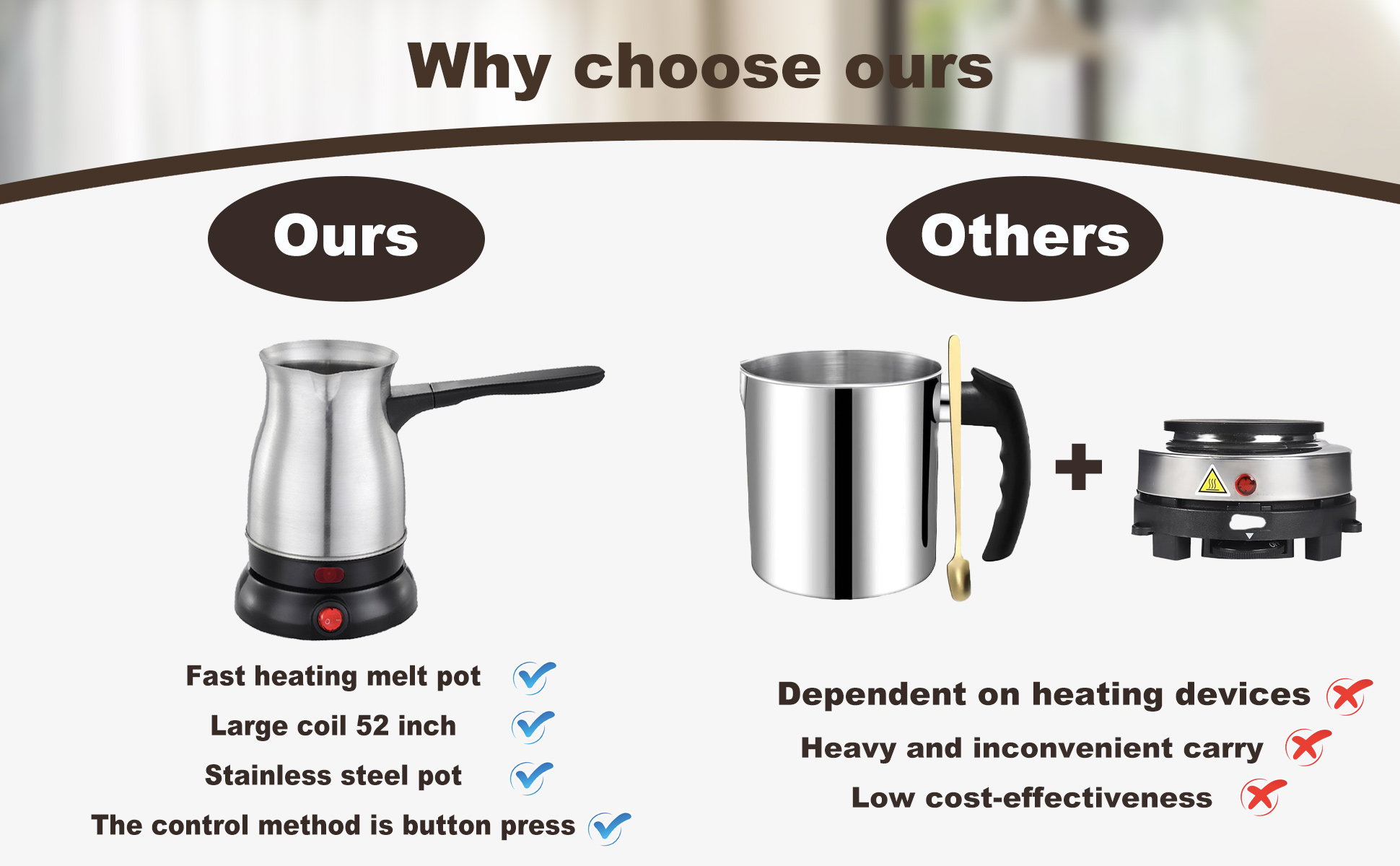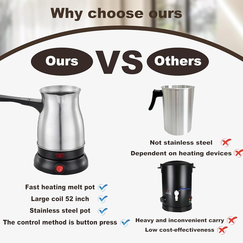 التطبيقات: وعاء الذوبان الخاص بنا مصنوع من الفولاذ المقاوم للصدأ بدرجة الطعام، ليس فقط لإذابة الشمع، ولكن أيضًا لصنع القهوة والشاي وأقلام التلوين وما إلى ذلك. يتم التحكم في فرن الصهر عن طريق زر، وسهل التشغيل والإيقاف، وسهل التشغيل.